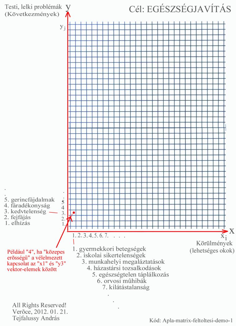 A kikérdezett személy(ek) a kézi módszernél is egy X-Y mátrixot tölt(enek) fel olyan módon, hogy az egyes xi (vektor) elemek és az yj (vektor) elemek kombinációt megjelenítõ egyes mátrix pontokhoz megadják (beírják) az ezen x és y elemek általuk ismert vagy vélt kapcsolat erõsségét jellemzõ számértéket. Például az alábbi 0 - 10-ig terjedõ skálán így pontozhatják az egymással való kombinációjukban vizsgált, adott xi és yj vektor elemek köztötti kapcsolat erõsségét: