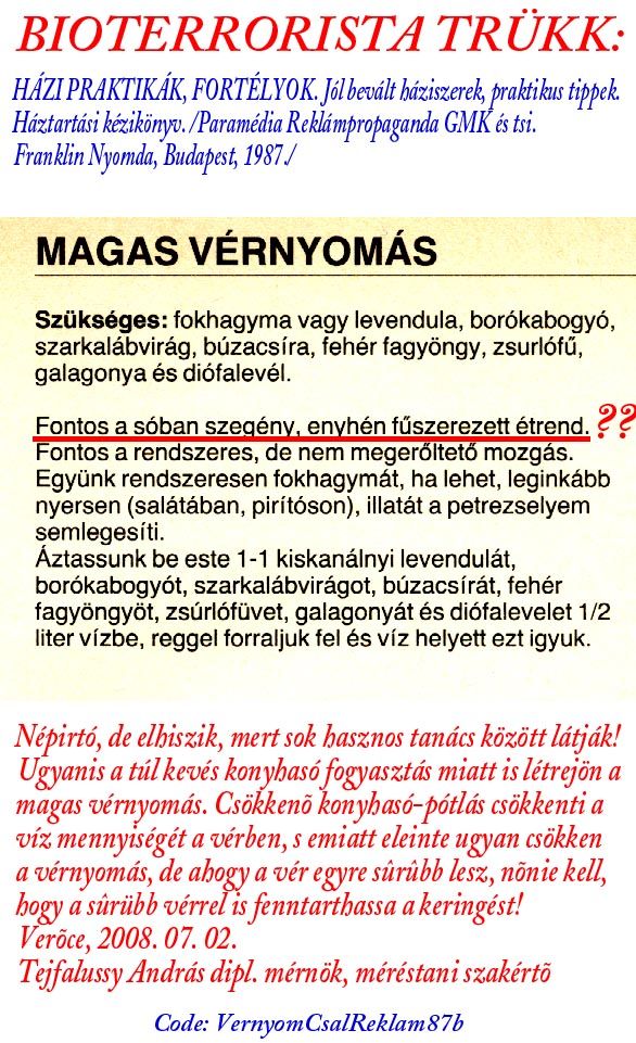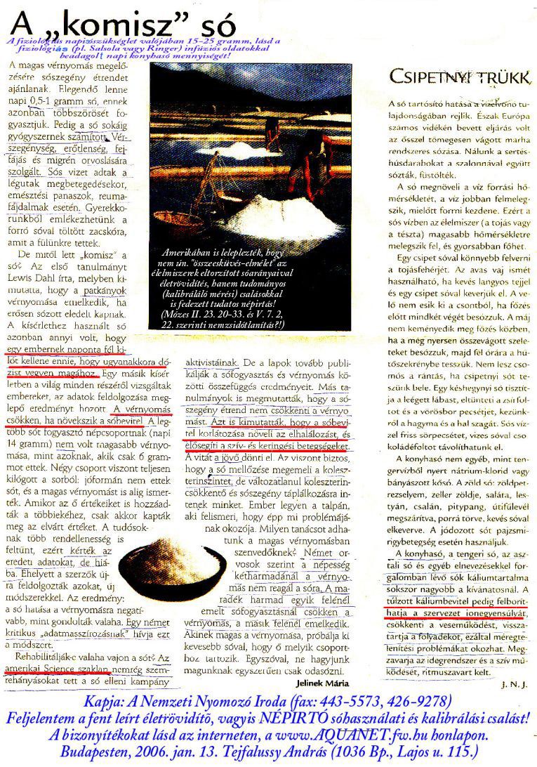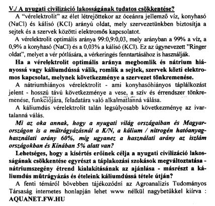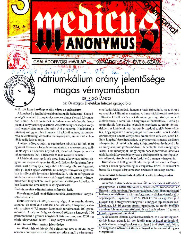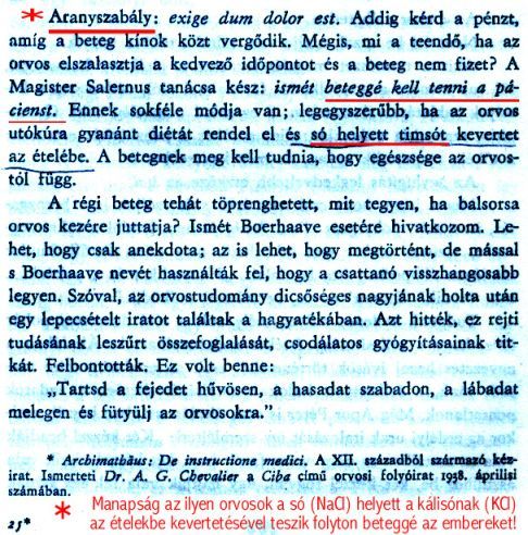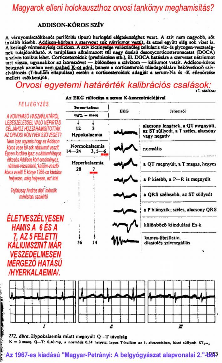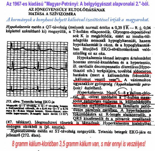 Közismert, hogy ezeket a problémákat más okokra vezetik vissza, miközben ezt a két fő okot nem csak elhallgatják, de ellenkező hatásúnak tüntetik fel. Az élettani optimum szerinti fiziológiás sózást, a vér elektrolitnak a nátrium-, kálium- és víz arányának megfelelő étkezést elavultnak hazudják, holott annak helyességét a tengervíz, a magzatvíz és a vér és a fiziológiás infúziós Ringer oldat azonos nátrium és kálium aránya is egyértelműen igazolja, de az is, hogy kisebb kálium túlfogyasztás esetén is torzul az EKG, vagyis romlik a szívműködés. A fenti könyvről készített másolatokat, s a többi fent említett mérési- és tankönyvi dokumentumot is le lehet hívni, ki lehet nyomtatni az internetrõl, amihez a Google keresőbe a mellekvesekerges szót kell beírni.