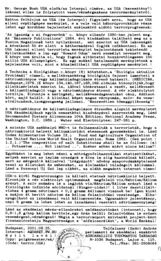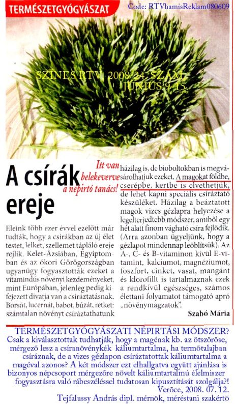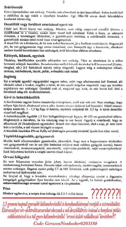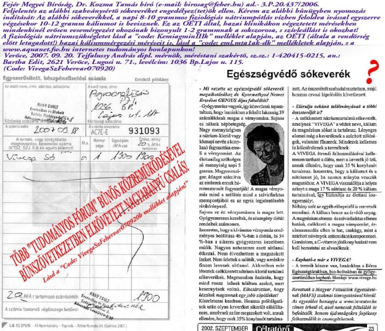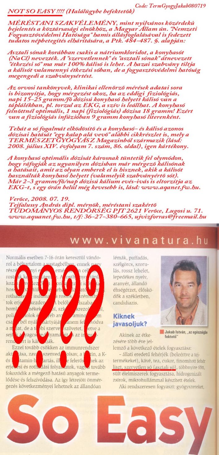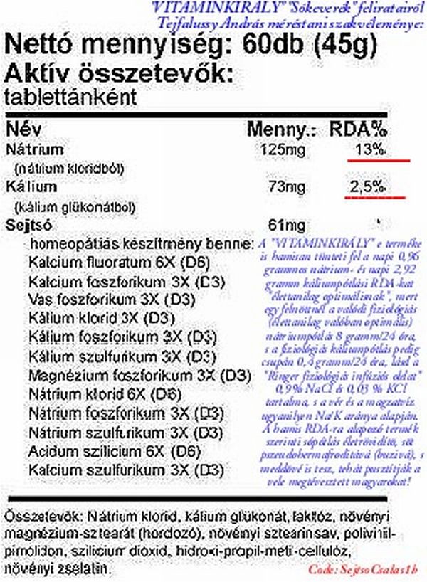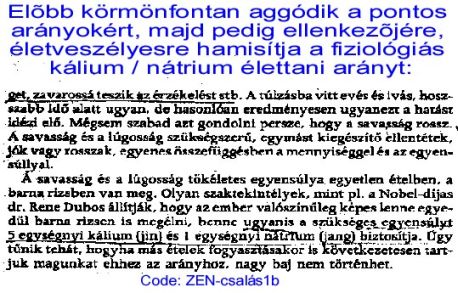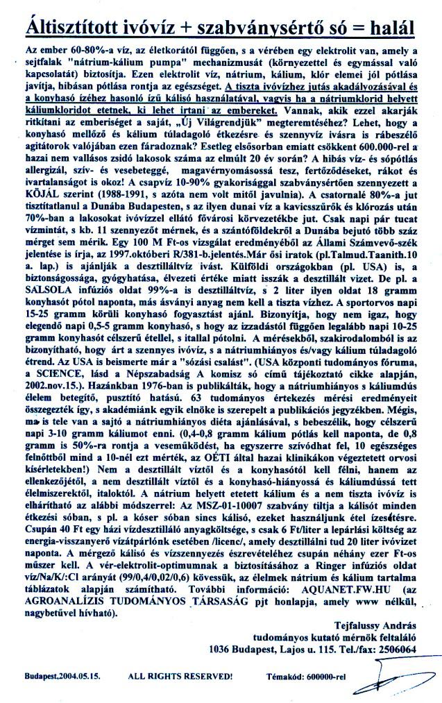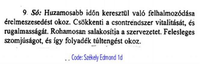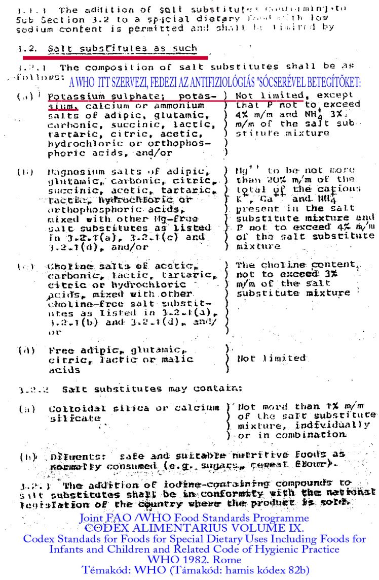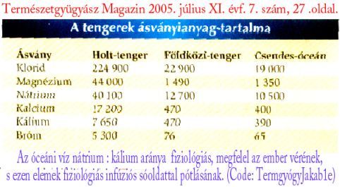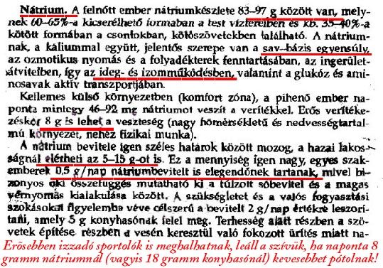 Az ennél sokkal kisebb dózisú nátrium pótlás nem egészséges. Manapság az lett a divat, hogy a legtöbb természetgyógyász és orvos csak ½ - 2 gramm/fő/nap dózisú nátrium pótolást javasol, s a konyhasó helyett más sókat és ezen más sók rossz ízének az elnyomására fűszereket adagoltatnak az ételekbe, italokba. Ezek életrövidítő, ivartalanító, pszeudohermafroditizmust (buziságot) stb. okozó, súlyos egészség károsodást, életrövidülést, a nem kóser étkezésű lakosság kívánt mértékben való tömeges kipusztulását előidéző hatásúak. Csalásról van szó, vagy tudatlanságról? A www.aquanet.fw.hu internetes honlapunkon közzétett bizonyítékok szerint tudatos csalás, népirtás eszköze mind a nátriumpótlás akadályozás, mind a konyhasó megszokott sós ízének nátriummentes vegyületekkel pótoltatása, mind a desztillált víz ivóvízként használatának a mérgezőnek feltüntetése. A nem kóser étkezésű magyarok (magyarok, cigányok, zsidók stb.) kipusztulásának a tényleges mértékét pl. a konyhasó helyett kálisót, káliumcitrátot, timsót stb. tartalmazó bolti élelmiszerek, élelmiszer alapanyagok százalékos arányával és a víz klórozás mértékével lehet a nem kóser étkezésűek nyugdíjbefizetéseinek a kóser étkezésűek részére kifizethetőségéhez, s az betelepülő nem magyarok ingatlan szerzéséhez, vagyis az ingatlanokban utazók legnagyobb hasznát eredményező mértéken tartani. Átlagosan kb. 100.000 fővel kisebb a magyarok szaporulata, amióta elkezdték a nem kóser élelmiszerek konyhasótartalmának a csökkentését és a káliumtartalmának a növelését, vagyis 1960 óta, ugyanis akkor kezdték el a kálisóval mérgezően műtrágyázással többszörösére növelni az élelmiszernövények káliumtartalmát (és egyéb mérgező anyag tartalmát).