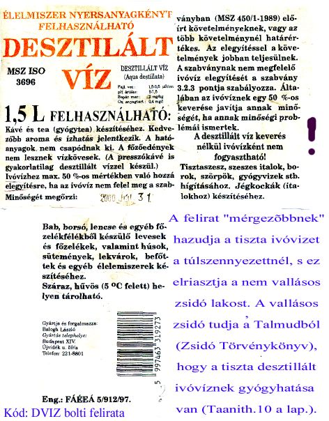 A Mózes II. 23. 20-33-ban is már leírt népirtási programnak az egyik legolcsóbb és leghatékonyabb eszköze, hogy a nem kóser kenyeret a konyhasó sós ízét pótló káliumvegyületekkel készítik és a nem kóser ivóvizet a fertőző vírusoktól és baktériumoktól és mérgező vegyi anyagoktól megtisztító desztillálást károsnak, és a desztillált ivóvizet "vízmérgezést" vagyis életveszélyes sóhiányt okozónak tüntetik fel hivatalos előírásokban (lásd: magyar szabvány), holott a szükséges mértékben való konyhasó pótlás hivatalos szervek részéről is folytatott tudatos akadályozása és nem a desztillált ivóvíz okozza az életveszélyes sóhiányt. (Kb. 15 liter/fő/nap dózisú desztillált víz ivás okozhat a konyhasó megfelelő mértékben pótolni nem hagyása esetén a "vízmérgezést", a vér elektrolit víz és só arányai túlságosan eltorzításával.)