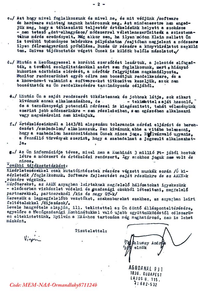 Fõtéma: TEJFALUSSY ANDRÁS ÁLTAL A SZABADALMAI SZERINTI SOFTWARE-K ÉS LÉTESÍTMÉNY-TERVEK SZERZÕI JOGAI FENNTARTÁSA