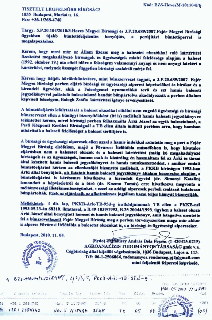 4./ Balogh Zsófia nem "sérült idegállapotban" volt, hanem szinte kómában, amikor Horváth Péter zsarolással is kísérletezve sikertelenül próbálta aláíratni vele a fenti hamis baleseti jegyzõkönyvet, ill. elõzõleg egy másik még hamisabbat, valamint egy hamis munkaszerzõdést is, amelyet Árki József elõre aláírt.