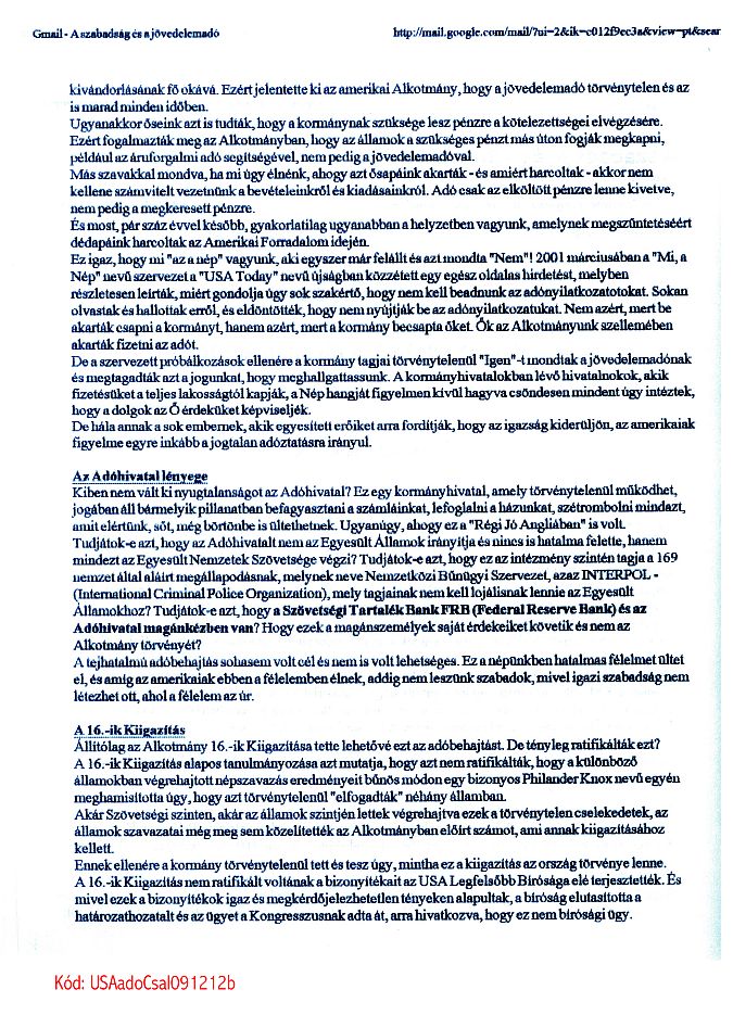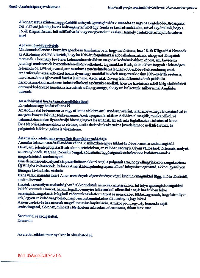 TISZTELT HÖLGYEK ÉS URAK! Javaslom, hogy - lehetõleg elõször a választások elõtt, s azután is, rendszeresen - kérdezzünk ki valamennyi jelentõsebb politizáló személyt és szervezetet az eddigi és tervezett további tevékenységeirõl a magyarországi kormányzati csõd mind a 10 (tíz) fenti titkos fõ okával kapcsolatban, a magyar gazdaság és a magyarok egészsége tönkretételével kapcsolatos büntetõjogi felelõsségek tisztázásával! Kérdezem, ki tud segíteni jelen irat terjesztésével, pl. a teljes saját levelezõlistáján továbbküldésével, s a gyûjtött információk közzétételében segítéssel?
