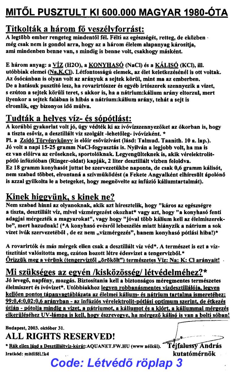 A Mózes II. 23. 20-33. és Talmud, Taanith 10 a. lap, és Baba Kamma 93 b. lap szerinti élettér rablási, lassanként népirtási zsidó technológia (software), hogy módszeresen lebeszélik a nem kóser étkezésû magyarokat arról, hogy õk is a zsidók egészségvédelmét, ill. rákból stb. kigyógyulását biztosító kálisómentes tiszta konyhasót és a tiszta desztillált ivóvizet alkalmazzák étkezési és infúziós célokra (a víz, a nátrium, a klór és a kálium fiziológiás mértékben pótlására)!