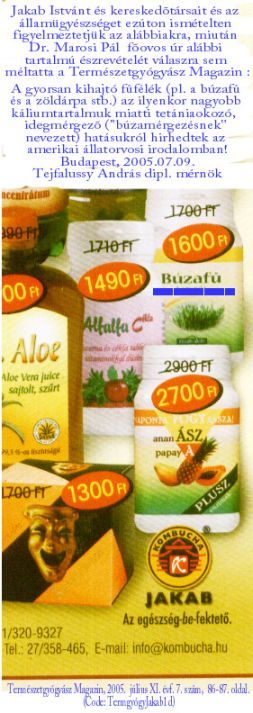 A Természetgyógyász Magazin is hasonló propagandát folytat, a konyhasó hiányosan a kálium mérgezõen túladagolva pótlását 9sztönzi. Pl. inni ajánlja az USA állatorosi tankönyv szerint kálium túladagolást mérgezést okozó "búzafû" levét!