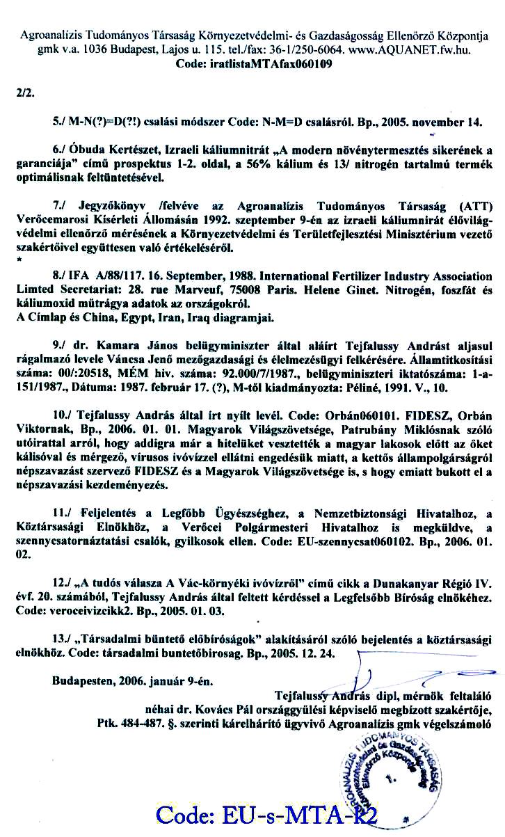 Nyilvános közérdekû országos kárelhárítási feljelentés (pótmagánvád bejelentése) a Legfõbb Ügyészségre, a Nemzetbiztonsági Szolgálathoz, Interpolhoz és a Köztársasági Elnökhöz (Code: EU-FVM-MTA-060103)