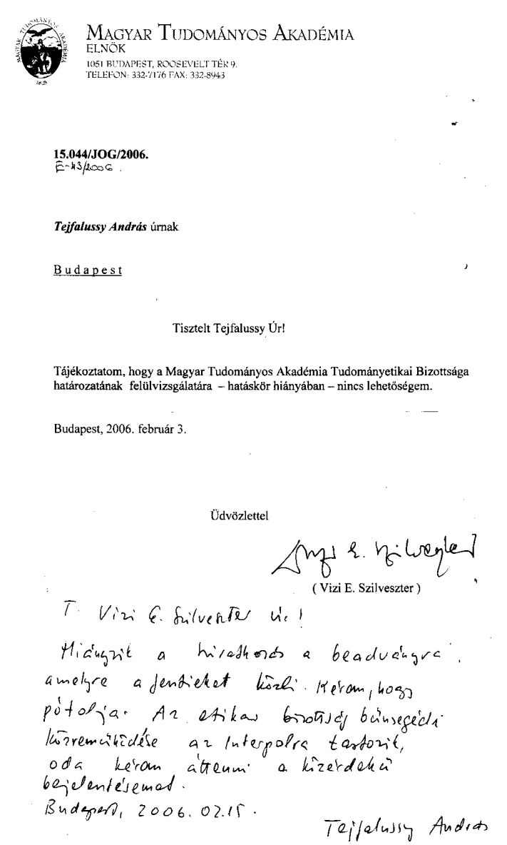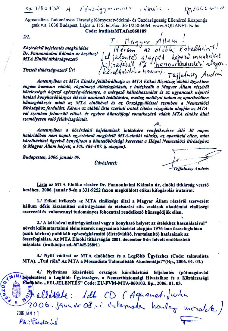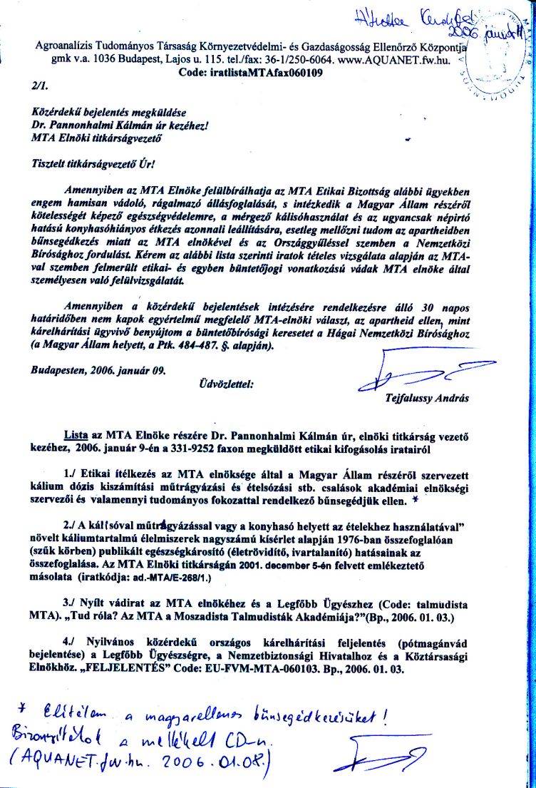 Copy: Tájékoztásul Drábik János úrnak, a www.AQUANET.fw.hu internetes honlap 2006. 01. 03-i CD másolatával.