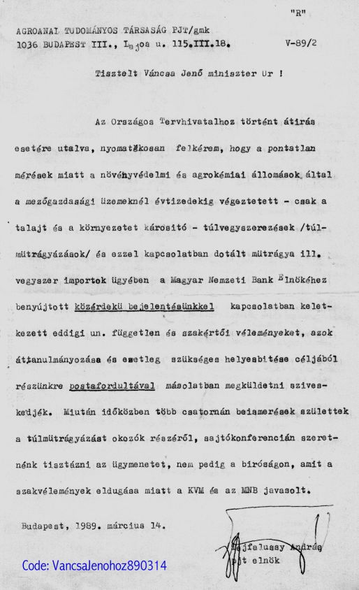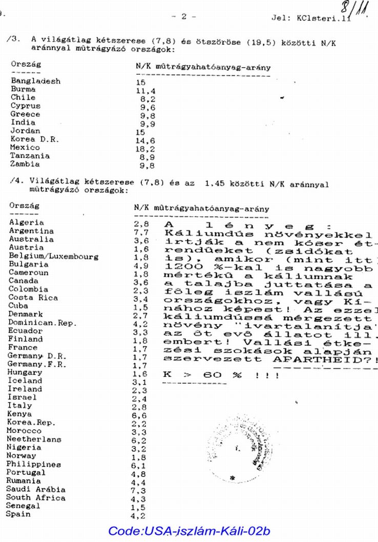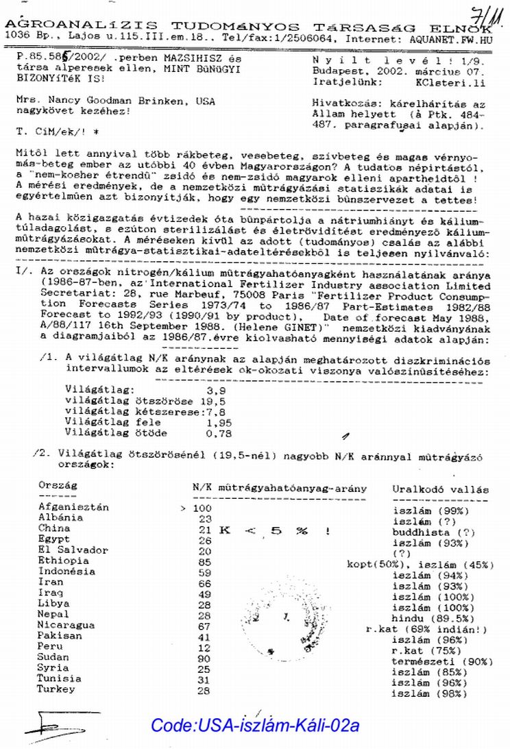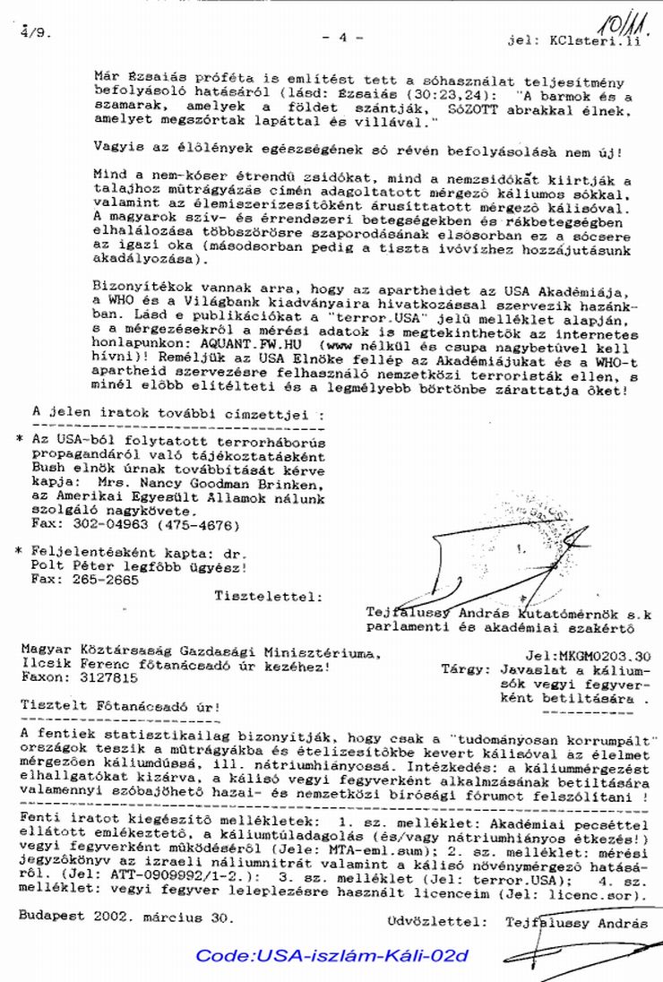 A nagy kálium tartalmú mérgezõ sókeverékeket, pl. a REDI-sót, a kálisót valamennyi étkezési felhasználású sókeverékben minden mennyiségben szigórúan tiltó MSZ-01-10007-82. számú kötelezõ magyar szabvány pontatlan rendelet fogalmazások útján való kijátszásával, csalással hozták és tartják forgalomban, az Országgyûlés, valamennyi minisztérium és kormány, a Magyar Tudimányos Akadémia elnöksége áés Etikai Bizottsága, valamint a Magyar Szabványügyi Testület, az orvosi lapok, az ügyészség, rendõrség, bíróság is bûnsegédkezik benne, vagyis a népirtásban.