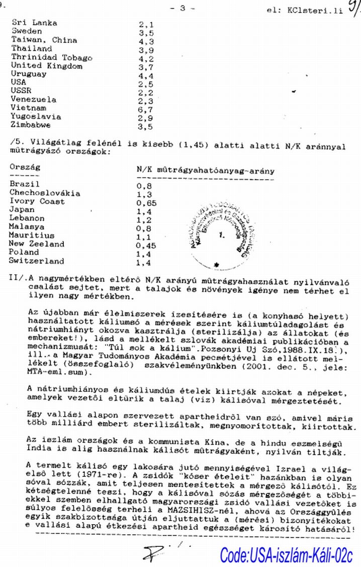 Ezután a holokauszt hatású antiriziológiás nátrium- és kálium pótoltatást szervezõ akadémiai professzorok elkezdték tanítani, elhitetni azt a gyakorló orvosokkal és a magyar lakossággal (de csak a nem talmudistákkal, mert a vallásos, kóser étrendû zsidók mind jól tudják a Talmudból azt, hogy nem szabad csökkenteni a fiziológiás konyhasó-pótlást, mert aki csökkenti, az megbetegszik), hogy "nem szükséges fiziológiásan pótolni a nátriumot konyhasóval', meg azt, hogy "a káliumból a korábbinál sokkal többet kell enni", s hogy a káliumból akár "70 grammot is veszélytelen egyszerre megmegenni", s eközben igazságügyi szakértõként meghamisították a tankönyvek határértékeit, sõt letagadták, suembehazúdták azoknak a hazai klinikákon elvégzett ellenõrzõ méréseknek az adatait is, sõt letagadták a megtörténtét is, amelyek a kálium egyszerre megevett 1-2 grammos dózisainak a mérgezõ hatását kimutatták. A legnagyobb csalást az alábbi szakvéleménnyel klövették el, hogy leállítsák vele a rendõrség népirtás, közveszélyokozás kérdésében megindított nyomozását: