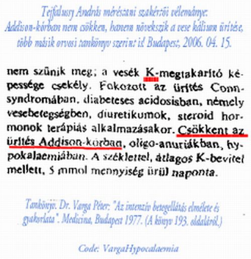 AZÓTA, VALÓSZÍNÛSÍTHETÕEN A MAGYAROK ELLEN A VÉRELEKTROLÍT EGYENSÚLYI ZAVARAUNAK AZ OKOZÁSÁVAL FOLYTATOTT MAGYAR KIIRTÓ HOLOKAUSZT SIKERE ÉRDEKÉBEN, AZ EBBEN RÉSZTVEVÕ EGYETEMI TANÁROK ÁTFOGALMAZTÁK A LÉNYEGET AZ ELLENKEZÕJÉRE. a NÁTRIUM HIÁNYOS TÁPLÁLKOZÁS, A KONYHASÓ HASZNÁLTARÓL FOLYTATOTT LEBESZÉLÉS ÉS A NÖVELT KÁLIUMTARTALMÚ ÉTELEKRE RÁBESZÉLÉS MIATTI VESEPUSZTULÁSRA JELLEMZÕ FOKOZÓDÓ KÁLIUMVESZTÉST ÉS NÁTRIUMVISSZATARTÁST ÉS AZ EZZEL JÁRÓ HALÁLOS ADDISON KÓRT NEM A NÁTRIUM-VISSZATARTÁSSAL ÁS KÁLIUMVESZTÉSSEL", HANEM ""NÁTRIUM-VESZTÉSSEL ÉS KÁLIUM-VESZTÉSSEL JELLENEZTÉK HAMISAN.