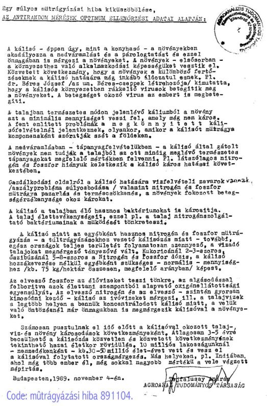 A mútrágyázás ürügyén a talajba adagolt és a növénnyel ezúton felszivatott kálisóval, az ezzel mérgezõre növelt kálium tartalmú élelmiszerekkel a tudósok "retard", azaz késve kárt okozó módon kiirtják az állatokat és az embereket. Emellett a konyhasóba kevert kálisóval is irtják õket. MÓZES V. könyve írja elõ az ilyen módon való népirtást: