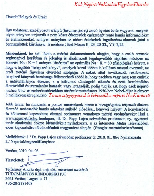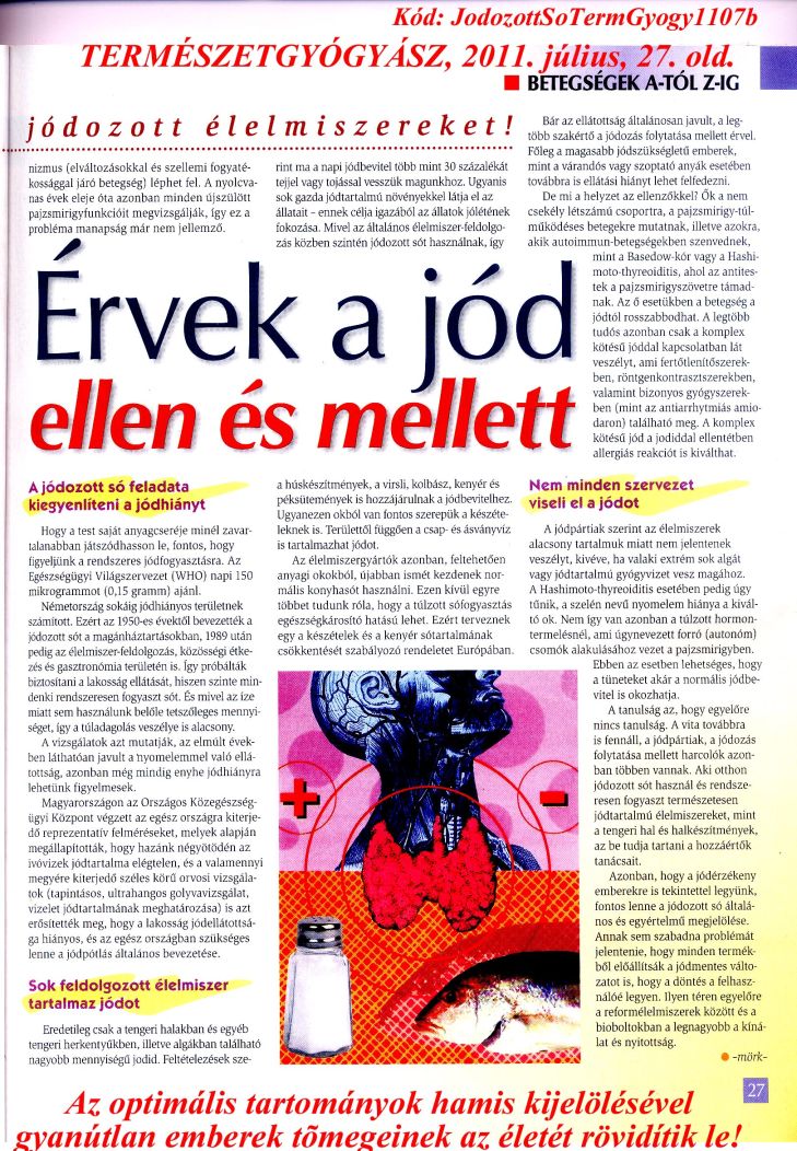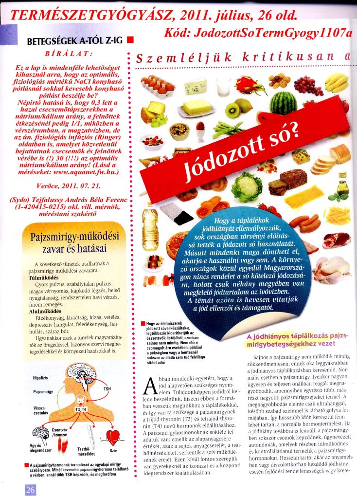 Fõtéma: ELLENREKLÁM, a Természetgyógyász magazinnal szemben, a 2011. júliusi száma 26-27. oldalán megjelentetett Érvek a jód ellen és mellett címû cikk mérések alapján valószínûsíthetõ népirtó hatása miatt: