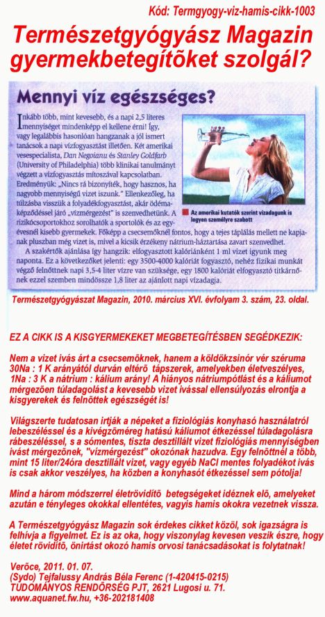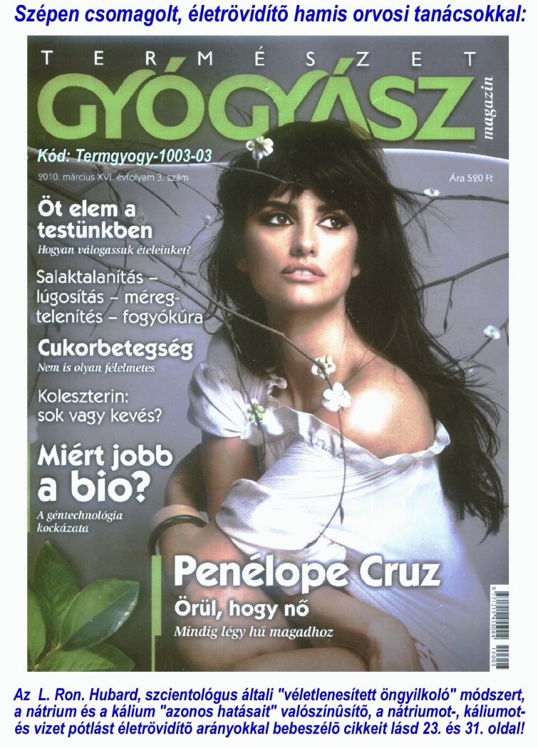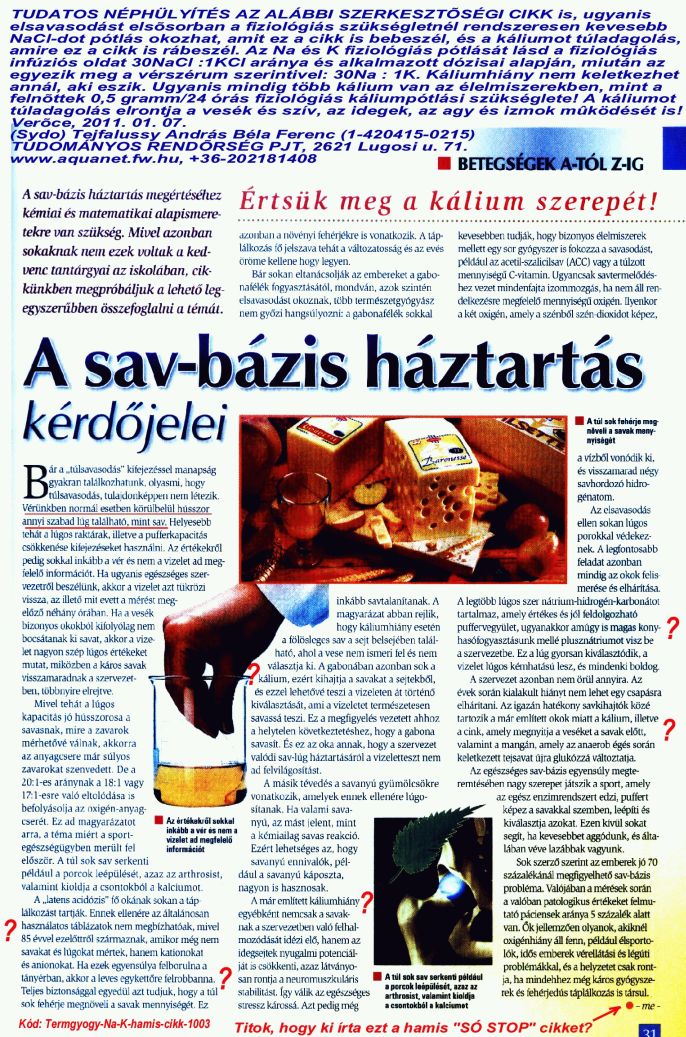 Fõtéma: TERMÉSZETGYÓGYÁSZ MAGAZIN egyes cikkei valószínûsíthetõen azt a célt szolgálják, hogy a magyarok ne értsék meg a kivégzõméreg káliumtúladagolás valódi szerepét és a fiziológiás (optimális) nátrium-, kálium- és vízpótlás szükségességét. (2010. március XVI. évfolyam 3. szám, 23. oldal, 31. oldal).