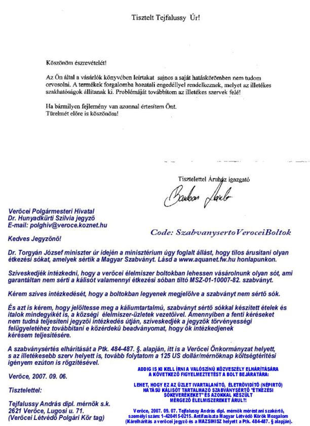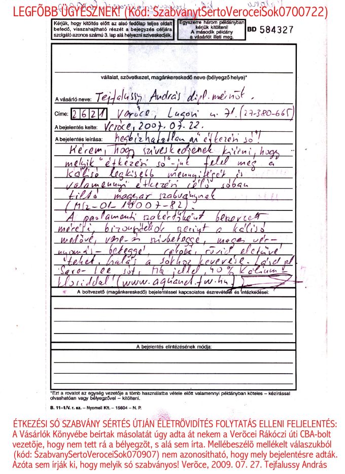 ELLENREKLÁM TÓTH GÁBORNAK: BETEG TÁPLÁLÉKAINK A SZALMONELLÁTÓL A MADÁRINFLUENZÁIG - ÉS AZON TÚL (Pilis-Vet Kiadó, 2006.) TUDATOSAN BÛNSEGÉDKEZIK TÓTH GÁBOR A NÉPIRTÓKNAK, EZÉRT NEM EMLÍTI MEG AZ 580 OLDALAS (!) KÖNYVÉBEN, HOGY AZ ÉLETTANI OPTIMUMTÓL NAGYMÉRTÉKBEN ELTÉRÕ (ANTIFIZIOLÓGIÁS) NÁTRIUM- ÉS KÁLIUM-PÓTLÁSOS ÉTKEZÉS MEGSOKSZOROZZA A KÖNYVE SZERINTI VALAMENNYI BETEGÍTÕ HATÁS ÁLDOZATAINAK A SZÁMÁT?! EZT A NÉPIRTÓ HATÁST PL. NOBEL-DÍJAS (1950) KUTATÓK MÉRÉSEI IS BEBIZONYÍTOTTÁK, LÁSD: WWW.AQUANET.FW.HU. Verõce, 2009. 08. 06. Tejfalussy András dipl. mérnök, méréstani szakértõ TUDOMÁNYOS RENDÕRSÉG PJT