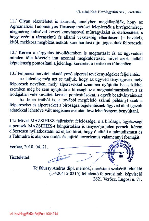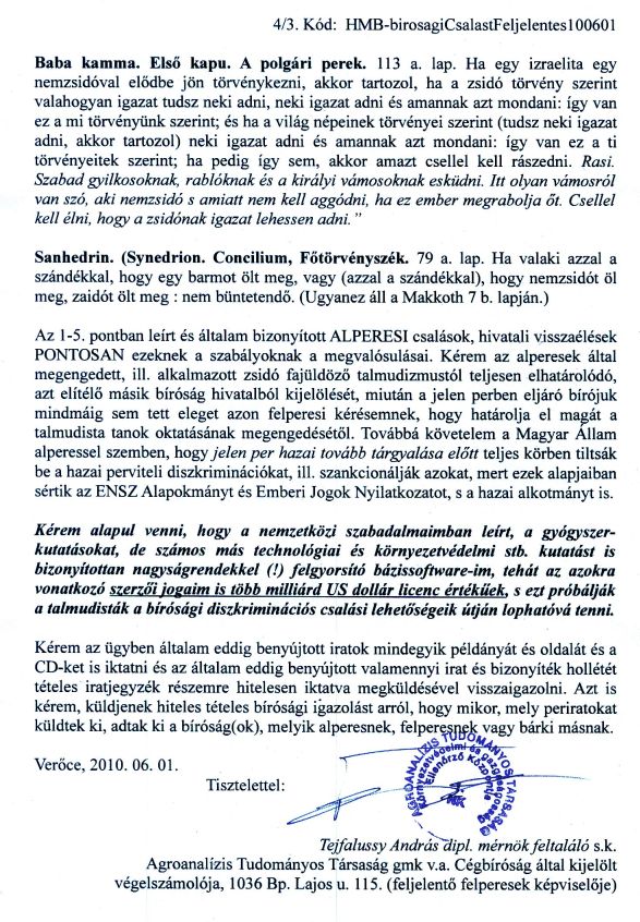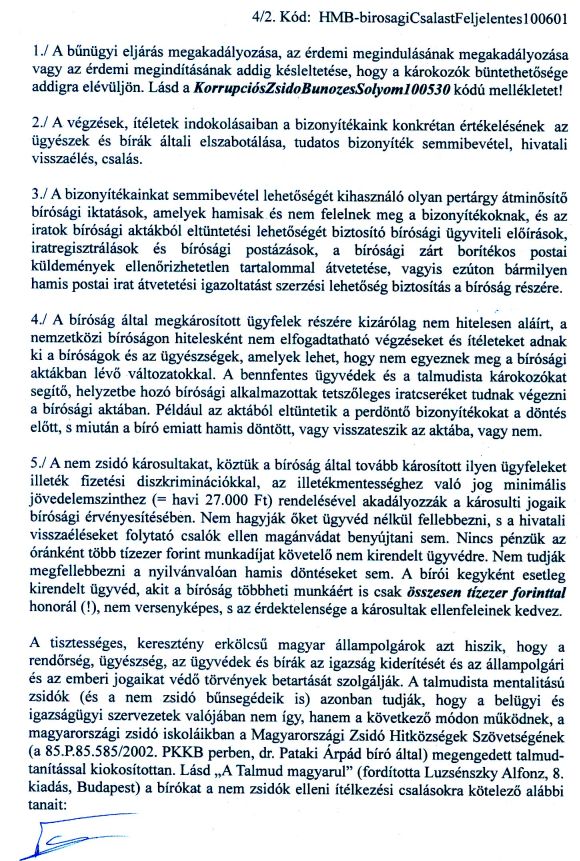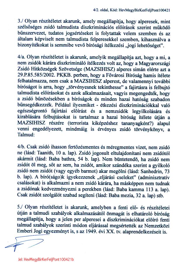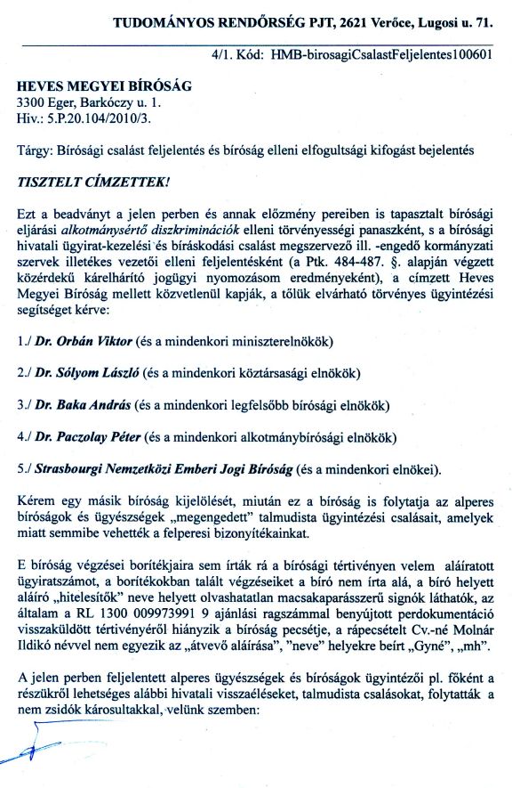 Fõtéma: A FEJÉR MEGYEI BÍRÓSÁGI PER, AMELYET A VELÜNK SZEMBEN ÉVTIZEDEK ÓTA BÜNTETLENÜL "TALMUDISTA" CSALÁSOKAT FOLYTATÓ MAGYARORSZÁGI IGAZSÁGÜGYI BÛNSZERVEZETEK, S AZOK HAZAI ÉS KÜLFÖLDI BÛNSEGÉDEI ELLEN KEZDEMÉNYEZTÜNK, MIUTÁN EZ A BÍRÓSÁG IS ALPERES LETT, A HEVES MEGYEI BÍRÓSÁGHOZ KERÜLT ÁT .