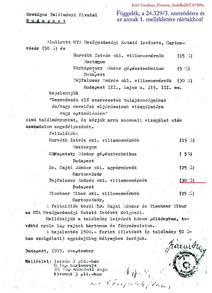 1975-BEN BENYÚJTOTT SZABADALMI BEJELENTÉS EGY SPECIÁLIS FITOTRON BERENDEZÉSRE, A TEJFALUSSY ANDRÁS 1970. SZEPT. 20-I ELSÕBSÉGÛ KUTATÁS GYORSÍTÁSI SZABADALMA SZERINTI GRADIENS TÉRKÉPEZÉSI SOROZAT SOFTWARE ALKALMAZÁSÁHOZ: