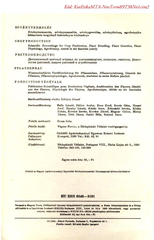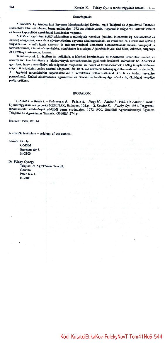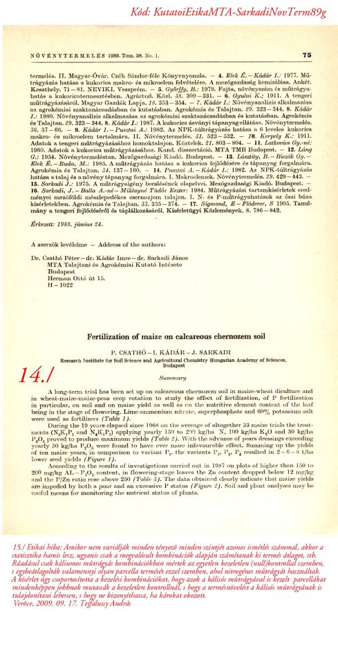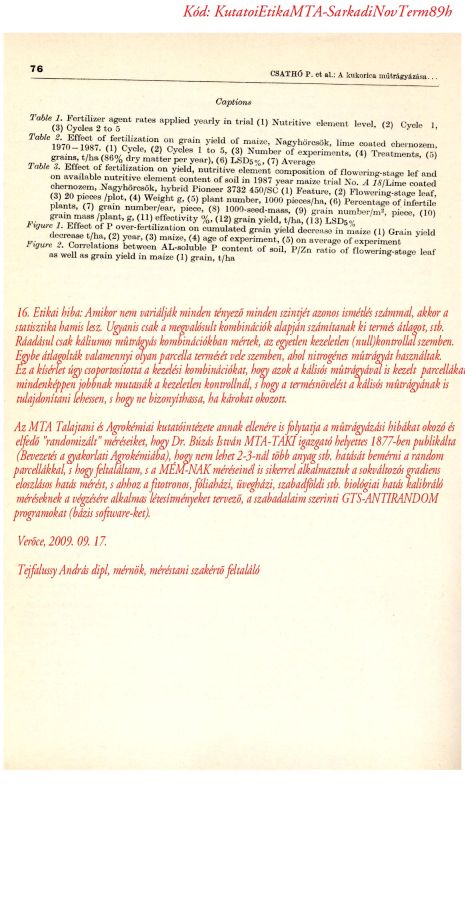 A BUDAPESTI KERTÉSZETI EGYETEM ZÖLDSÉGTERMESZTÉSI INTÉZETE ÁLTAL MEGHAMISÍTOTT ANTIRANDOM MÉRÉSI EREDMÉNY HIVATALOS HELYREIGAZÍTÁSA A MAGYAR TUDOMÁNYOS AKADÉMIA ELNÖKI TITKÁRSÁGÁNÁL, TEJFALUSSY ANDRÁS KÉRÉSE ALAPJÁN: