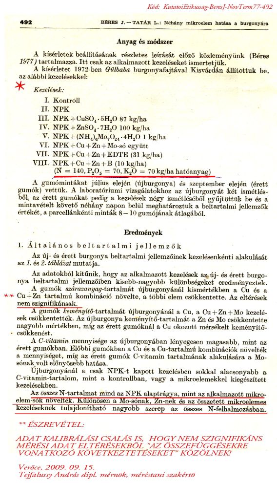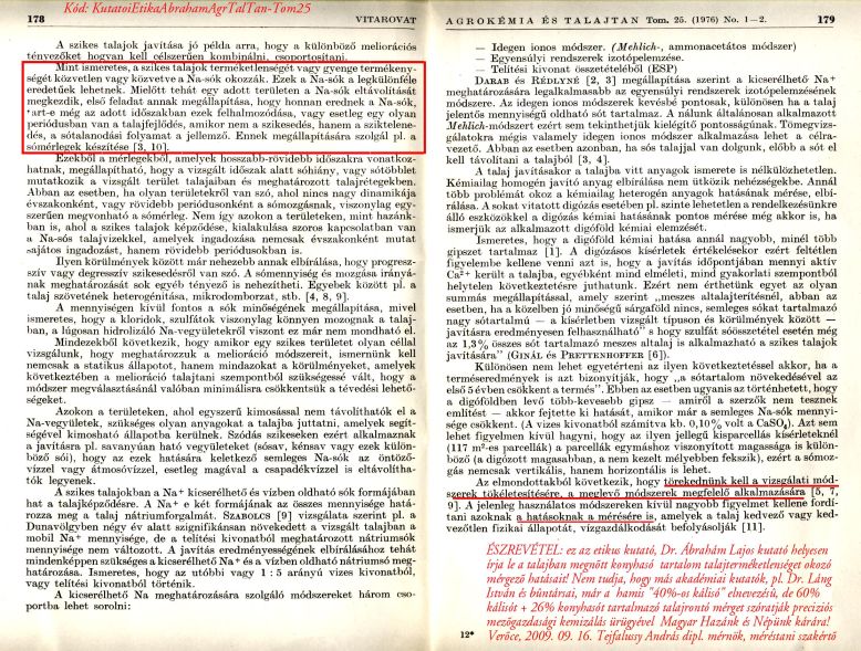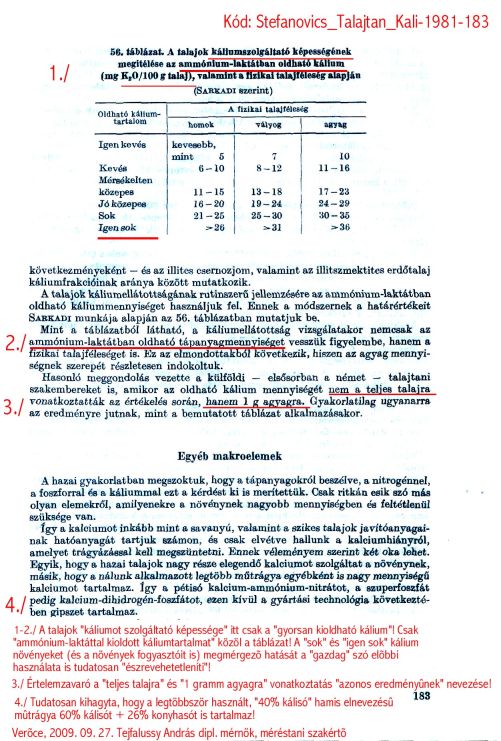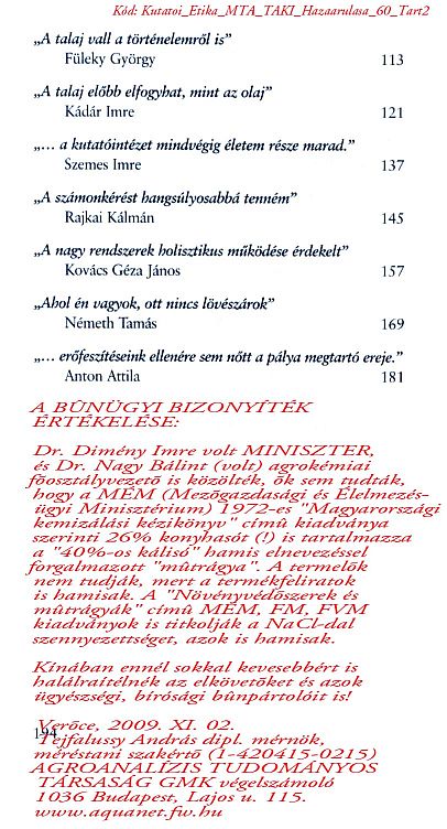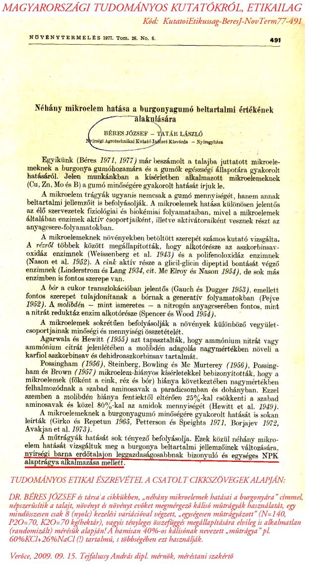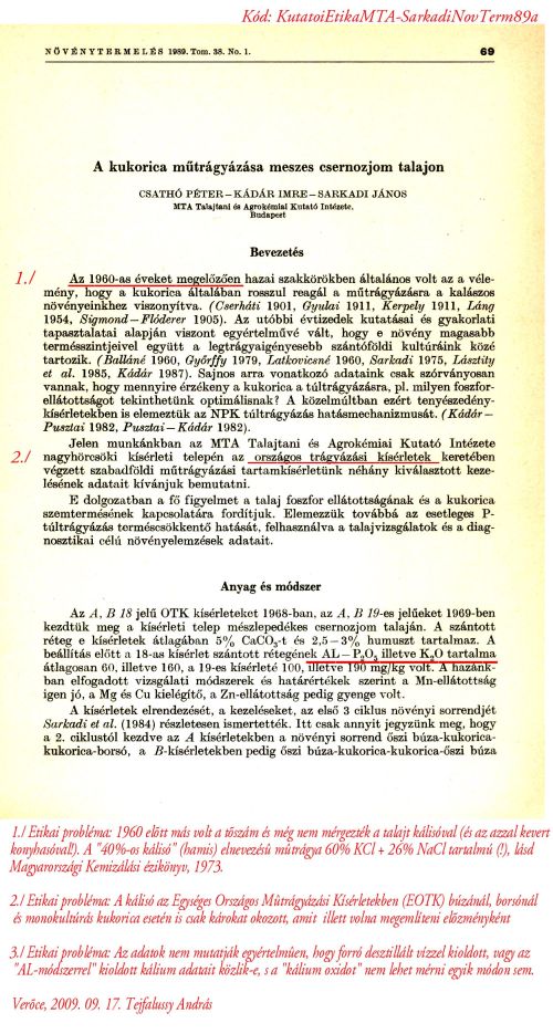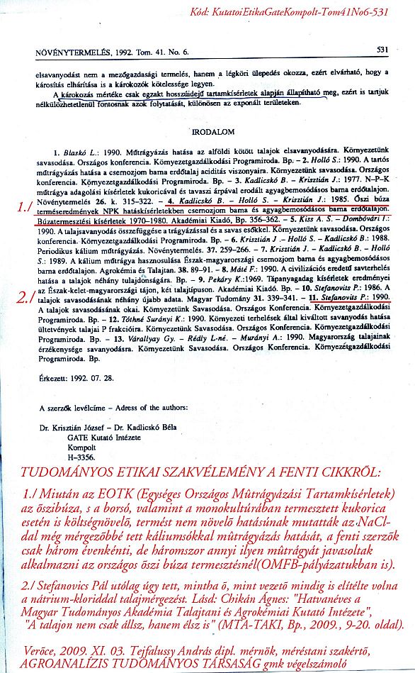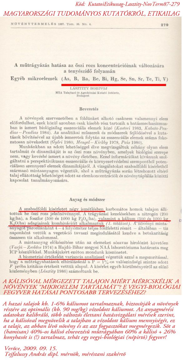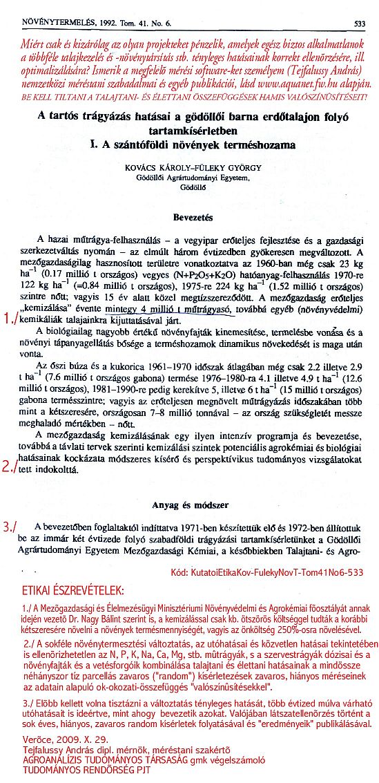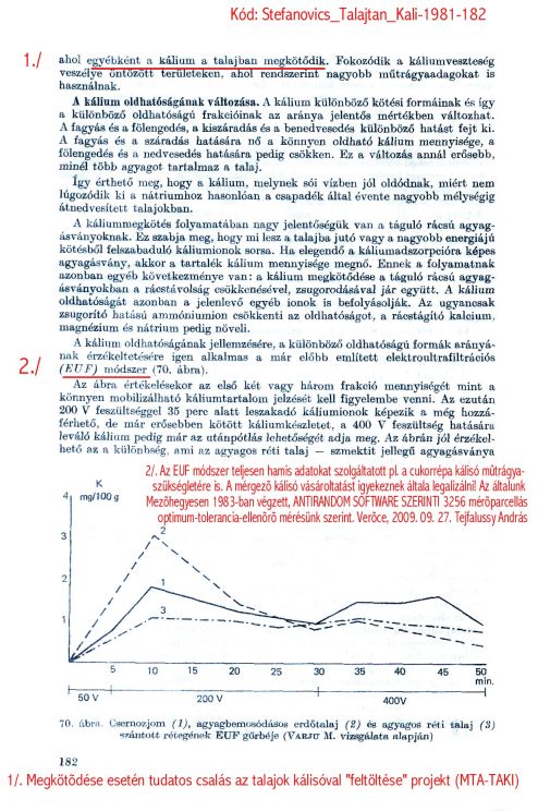 A Budapesti Kertészeti Egyetem Zöldségtermesztési Tanszék megszegte a Tejfalusy Andrással kötött szerzõdést, és hamisan értékelte ki mérést, és annak tényleges eredménye ellenkezõjét jelentette a Magyar Tudományos Akadémia felé, a kálisóval mûtrágyázást növény egészség javítónak, aszálykár csökkentõnek hazudták: