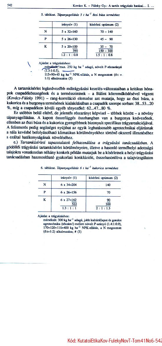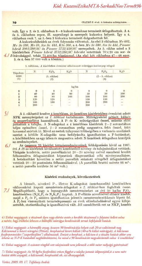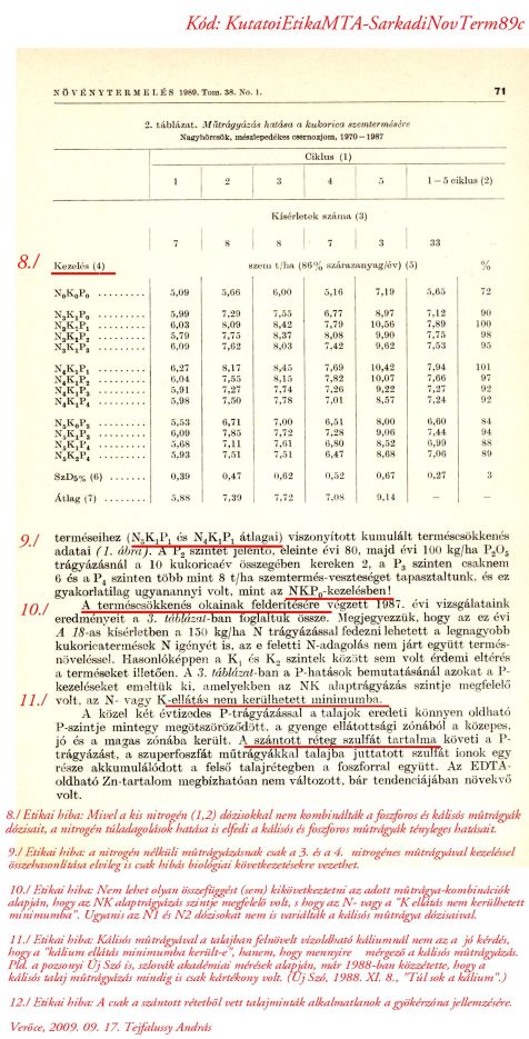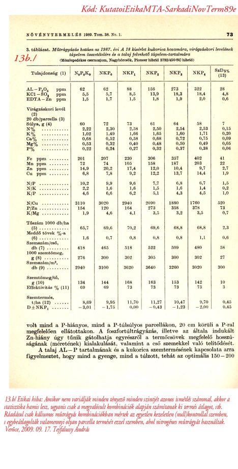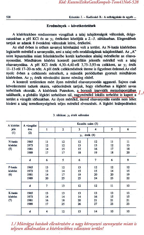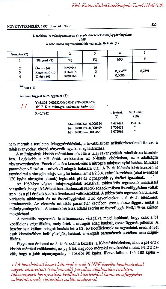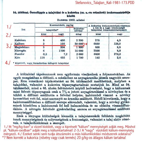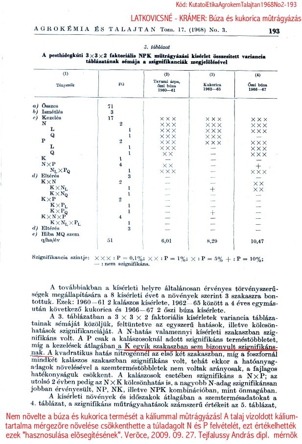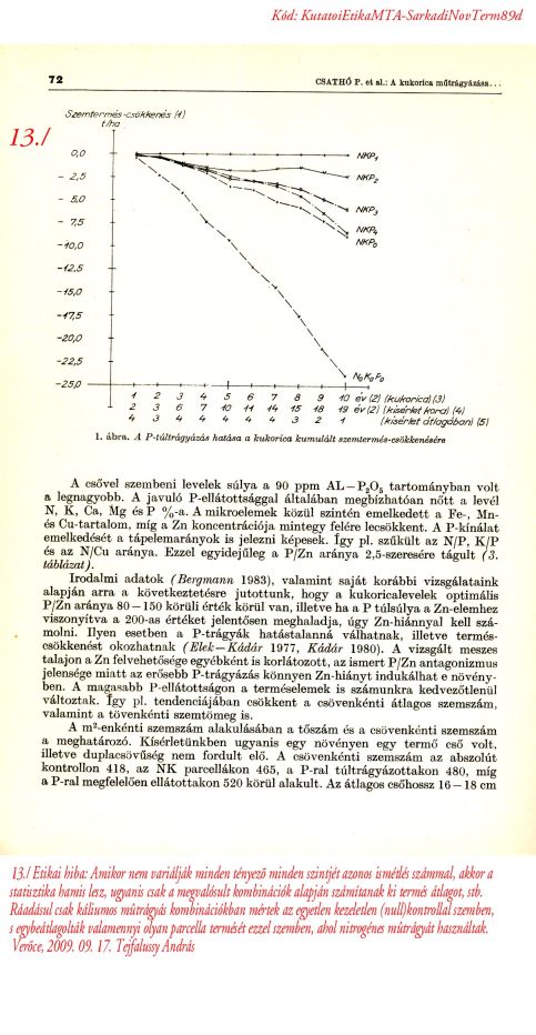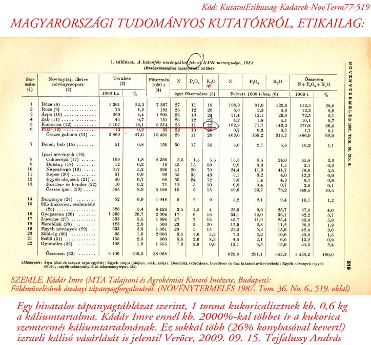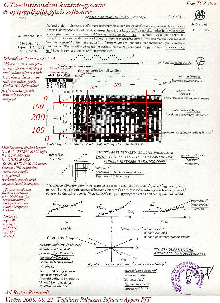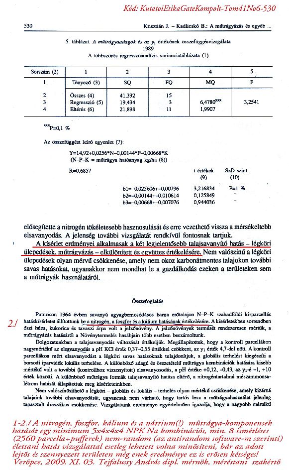 A Tejfalussy András szabadalmai szerinti GTS-Antirandom software alkalmazásán alapuló sokváltozós, teljeskombinációs szántóföldi N-P-K-mûtrágya- és tõszám hatás mérések kimutatták foszfor, nitrogén mûtrágya, tõszám és talajinhomogenitás relációban a kálisó mûtrágya nullánál nagyobb dózisai növényalkalmazkodást csökkentõ (betegító) károkozó hatását (növény: Pioneer 3732 US-hibrid kukorica, 1982. Ebes):