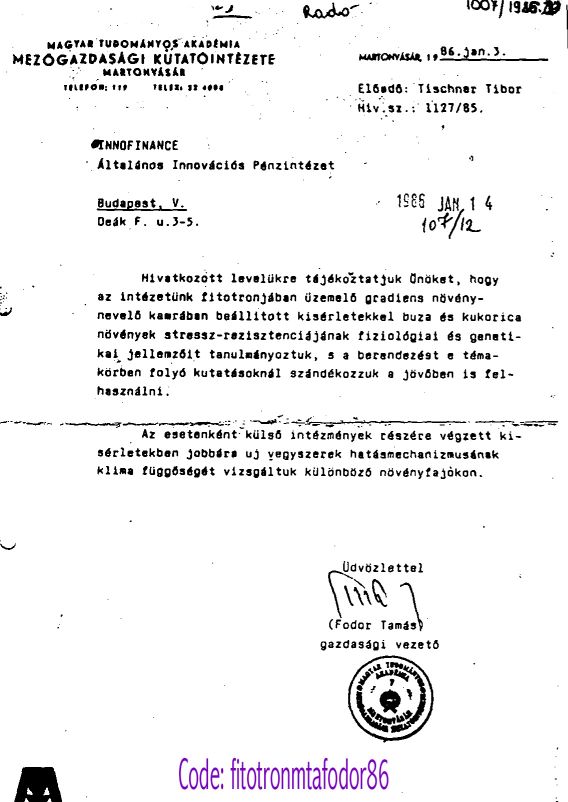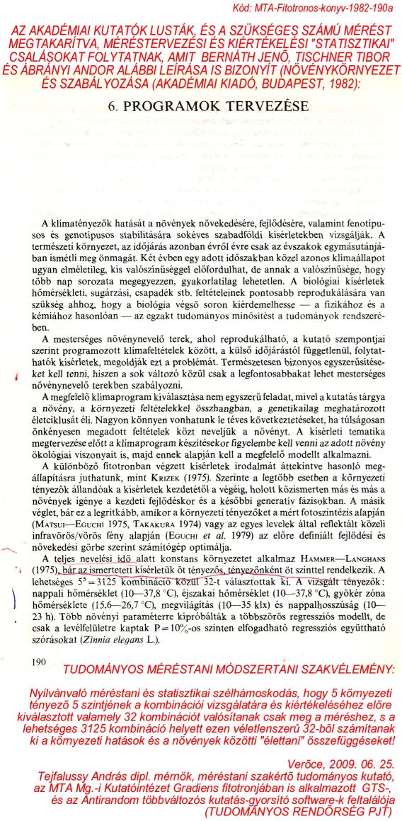 AZ MTA MEZÕGAZDASÁGI KUTATÓ INTÉZETBEN DOLGOZÓ BERENDEZÉS TÁRSFELTALÁLÓ IS LETAGADJA A GRADIENS FITOTRON MÛKÖDÕKÉPESSÉGÉT AZ ÁLTALA IS ÍRT ALÁBBI SZAKKÖNYVBEN: