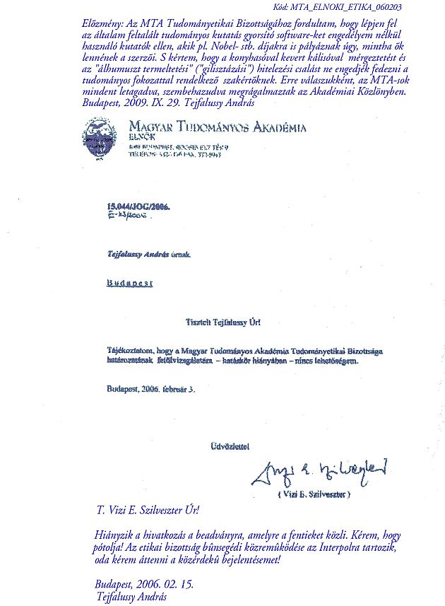 Mindezekrõl tud az Akadémia elnöksége, de egy Tudományetikai Bizottsági hamis határozatuk letagadja!