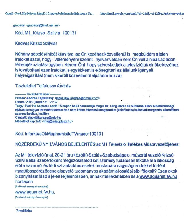 Fõtéma: Az M1 Televízió Szólás Szabadsága címû mûsor részére 2010. 01. 31-én nyilatkozó szakértõk hamis okokra vezették vissza a hazai férfi- és nõi szívinfarktusok száma nagyságrendi növekedését.
