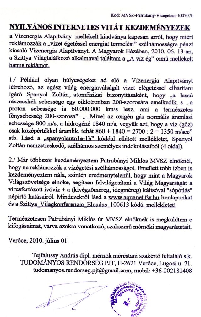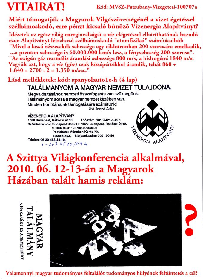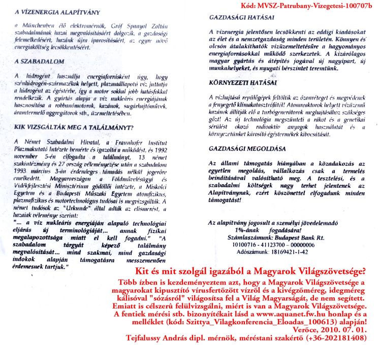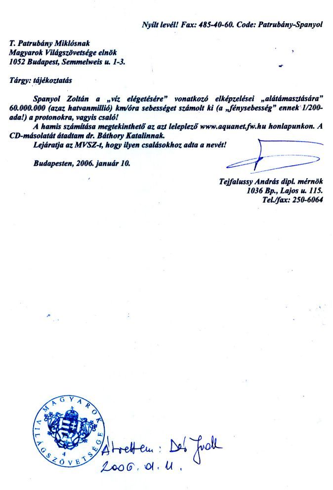 SEGÍTÕ NYÍLT LEVELEK a Magyarok Világszövetsége részére. I./ A"MAGYAROK FÖLDJÉÉRT, ÉDES HAZÁNKÉNT" (HONLEVÉL, 2006. február) cikk kapcsán. II./ A vizet elégetéssel energiatermelési csalást, III./ A kivégzõméreg, idegméreg kálisóval sópótlás és a vírusos, szennyezettvizet itatási csalás támogatás bûnügyeiben.