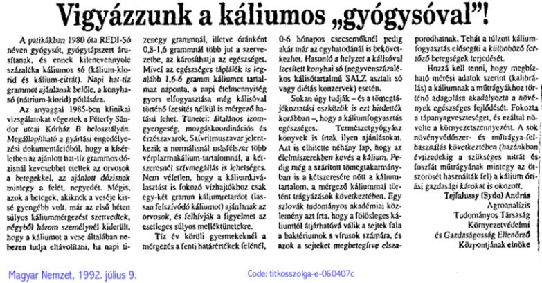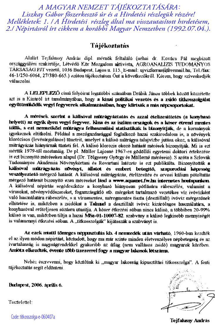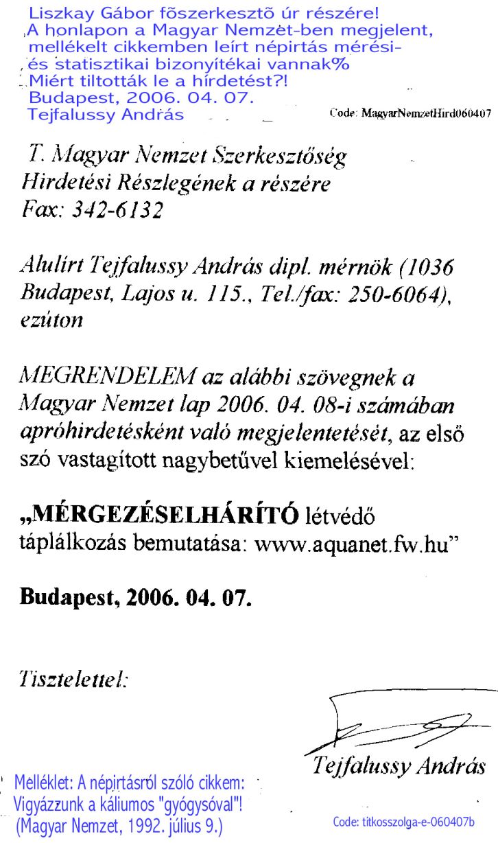 A Magyar Nemzet lap Szerkesztõsége miáért nem engedte megjelentetni az antifiziológiás nátrium-kálium pótoltatással és szennyezett ivóvízzel való magyar kipusztításról konkrét mérési- és statisztikai bizonyítékokat bemutató honlapunk címét is tartalmazó (2006. 04. 08-i) fizetett hirdetésünket?