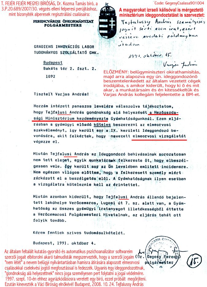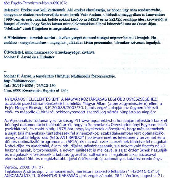 az alábbi pszichiátriai bûnözésért is felelõs Magyar Állam (a pénzügyminisztere) ellen, a Fejér Megyei Bírósági 3.P.20.689/2007/30. hamis végzés alapján az ügyben ítélkezõ elsõ- és másodfokú bírákról bebizonyosodott szerzõi jog sértés bûnpártolás alapján: