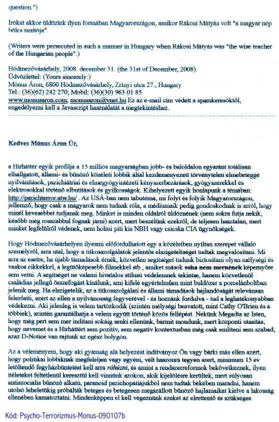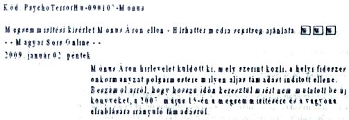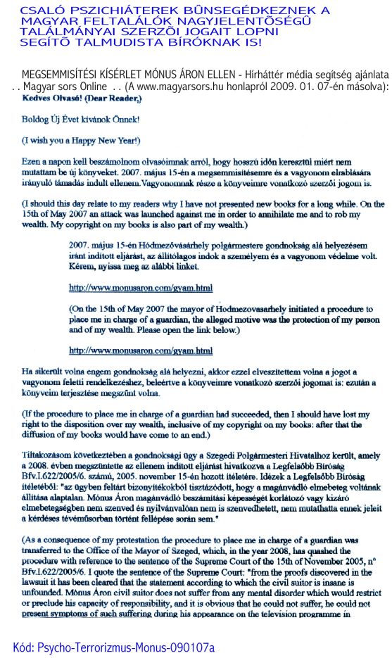 Melléklet: további legújabb bizonyítékként a magyarok szerzõi jogai érvényesítésének az akadályozására Magyarországon folytatott pszichiátriai és azzal összefonódott bírói bûnözésre: MEGSEMMISÍTÉSI KÍSÉRLET MÓNUS ÁRON ELLEN - Hírháttér média segítség ajánlata . . Magyar sors Online . . (A www.magyarsors.hu honlapról 2009. 01. 07-én másolva):