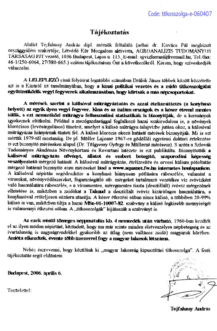 Copy: Tájékoztásul Drábik János úrnak, a www.AQUANET.fw.hu internetes honlap 2006. 01. 03-i CD másolatával.