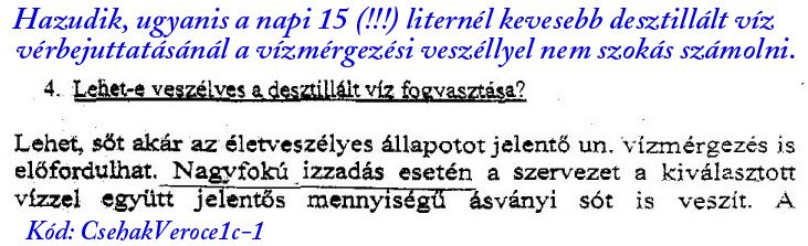 Az ÁNTSZ azt hazudja a honlapján, hogy vízmérgezést okozhat a tiszta desztillált víznek az étkezési úton vérbejuttatása, pedig ez a veszély csak napi 15 liternél több olyan víz vérbejuttatásánál jelentkezhet:,,a./