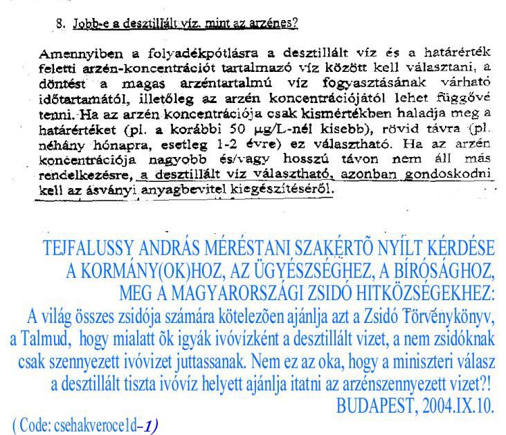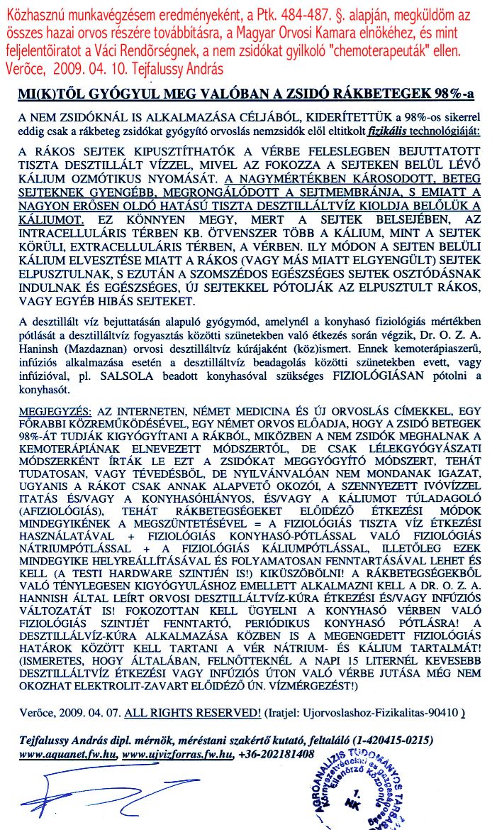 Világfõrabbi parancsára okoz rákot, akadályozva a nemzsidók gyógyulását a desztilláltvíz + konyhasó + kálium fiziológiásan vérbejutását mérgezõnek hazudó ÁNTSZ?!