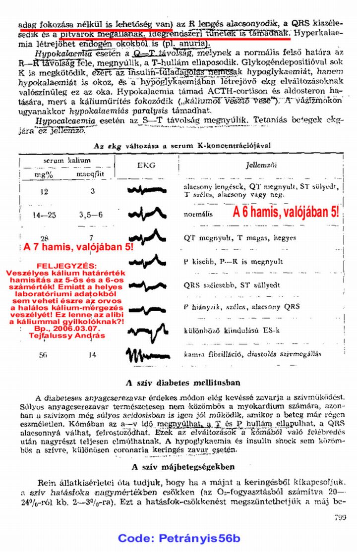 VAGYIS FELHAMISÍTOTTÁK UGYANEBBEN AZ ORVOSI EGYETEMI TANKÖNYVBEN (!) A VESZÉLYES KÁLIUMMÉRGEZÉST A VÉRVIZSGÁLATI ADATOKBÓL JELZÕ 5 MAEQV/LITER-ES VALÓS KÁLIUM-HATÁRÉRTÉKET 7 MAEQV/LITER-RE. AZÓTA AZ ORVOSOKNAK NEM KÖTELEZÕ ÉSZREVENNIÜK AZ INFÚZIÓ VAGY ÉTKEZÉS ÚTJÁN TÚLADAGOLT KÁLIUM MIATTI SZÍVMEGÁLLÁSI VESZÉLYT!