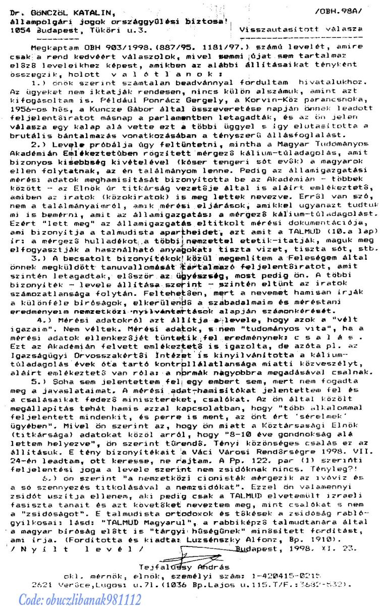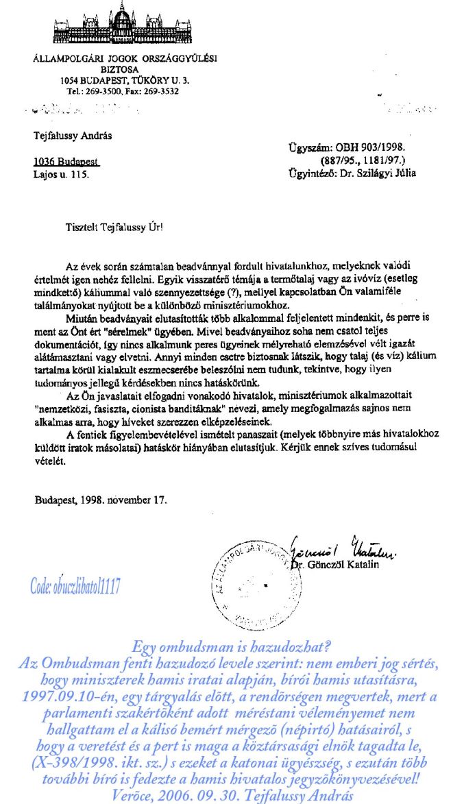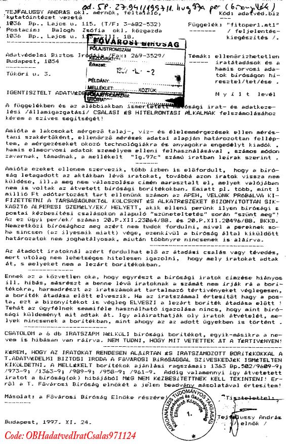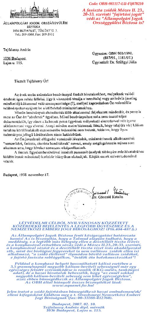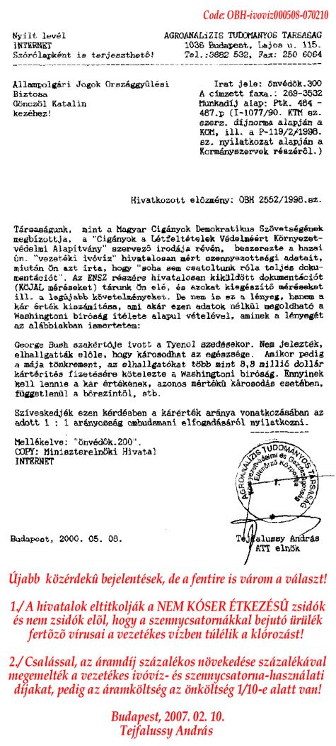 A fenti feljelentõ irat 2009- 07. 23-án faxon meg lett küldve a Strasbourgi Emberi Jogi Bíróság elnöke részére ("APARTHEID-Hungary-2009.09.23." címmel), a Legfelsõbb Bírósági elnök, Dr. Bak András részére ("Apartheid-bûnpártoló bírák?" címmel), s a legfõbb ügyész dr. Kovács András, valamint a Fõvárosi Fõügyészségen a témával éppen foglalkozó Áldottné dr. Gál Mária ügyész részére is (mint Ombudsmani bûnsegédkezés elleni feljelentés).