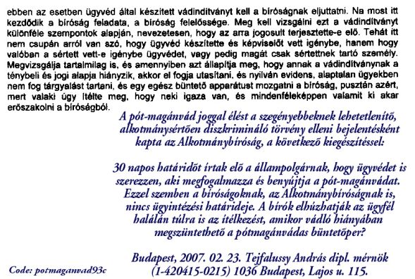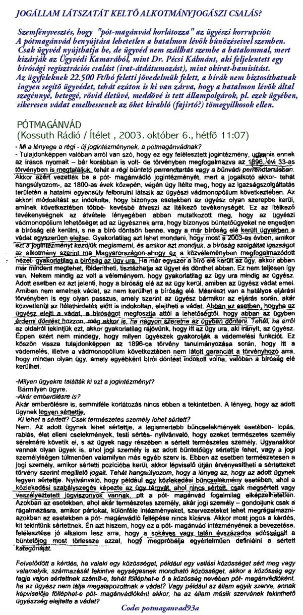 Itt kattinthat az állami alkalmazásban lévõ bûnözõk elleni pótmagánvád- (és fellebbezés-) vádemelés benyújtását akadályozó, jövedelmi alapú pervitelre jogosultsági diszkriminációk ellen a Strasbourgi Nemzetközi Emberi Jogi Bírósághoz benyújtott (újabb) panaszbejelentésre!