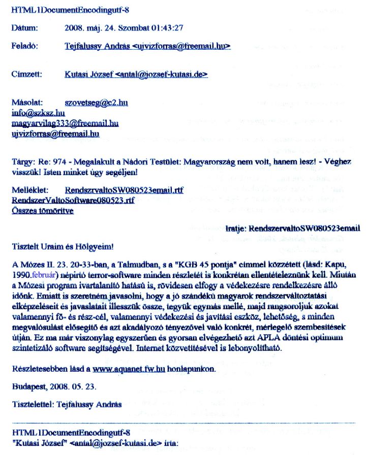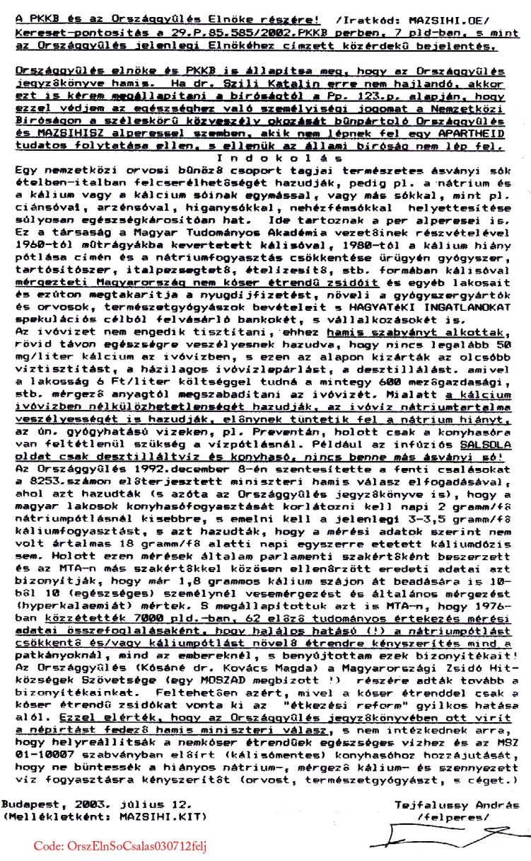 A neki szóló közérdekû bejelentésként is megküldött jelen dokumentum gyüjteményünk konkrét bizonyítékait valószínûleg éppen úgy nem méltatja majd válaszra az új köztársasági elnök (?), mint ahogy az általad az elõdjének megküldött közös közérdekû bejelentésünket a sürgetésed ellenére sem válaszolták még meg, s ki se vizsgáltatták.