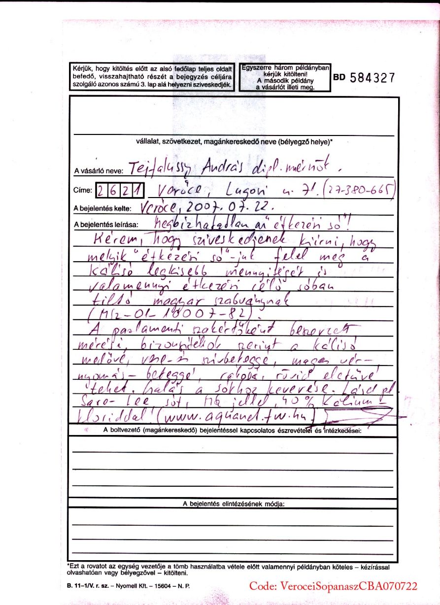 A fenti dokumentumok elegendõek kell legyenek ahhoz, hogy bármelyik önkormányzat (testülete) elõírhassa, hogy a boltok kiírják, hogy melyik só felel meg a valamennyi étkezési sóban a kálisó legkisebb mennyiségét is tiltó MSZ-10007-82. Magyar Szabványnak. Tehát a Verõcei Önkormányzat (Testülete) is képes kell legyen rá.