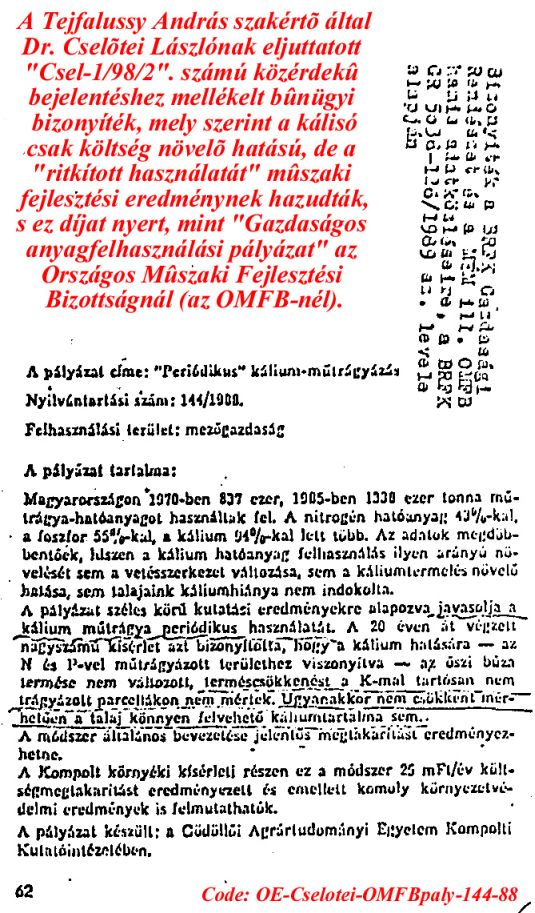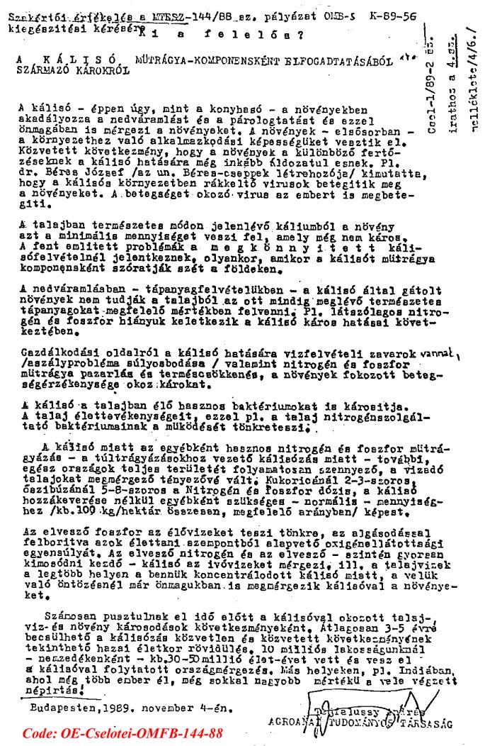 Jan Kralovich, szlovák akadémiai kutatóintézeti tudományos munkatárs nyilvános fellépése (cikk) a kálisóval mûtrágyáztatás növényeket mérgezõ, állatokat és embereket is megbetegítõ, pl. nemzõképtelenséget is okozó sejtmérgezõ, veszedelmes hatásairól.