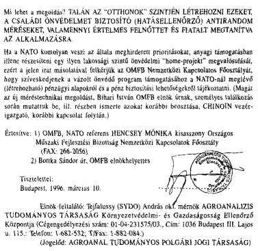 A MÛTRÁGYÁKHOZ KEVERT KÁLISÓVAL MÉG MÉRGEZÕBBÉ TETT ÉLELMISZERNÖVÉNYEK MIATTI KÖZÉRDEKÜ BEJELENTÉS MEGTORLÁSÁRA A BELÜGYMINISZTÉRIUM FORGALOMBA HOZTA AZ ÉRVÉNYTELEN HAMIS 1980-AS ELMEORVOSI SZAKVÉLEMÉNYT ÚGY, MINTHA AZ ÉRVÉNES LENNE.A TEJFALUSSY ANDRÁS SZABADALMAIT HASZNOSÍTÓ EGYIK TÁRSASÁGOT VEZETÕ VARJAS ANDRÁSNAK EGY LEVELET IRTAK TEJFALUSSY ANDRÁST LEJÁRATÓ, RÁGALMAZÓ TARTALOMMAL.
