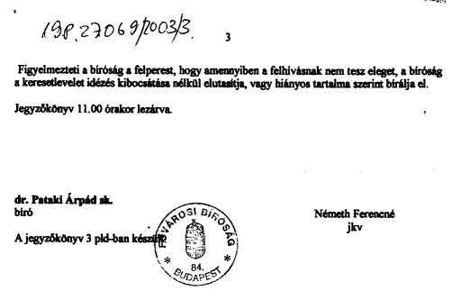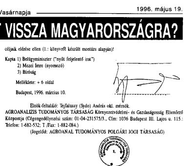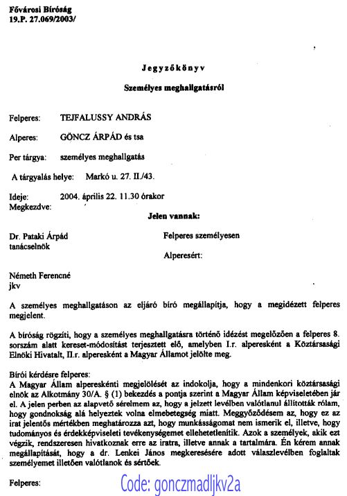 TEJFALUSSY ANDRÁS ÁLTAL INDÍTOTT PER A KÖZTÁRSASÁGI ELNÖKI IRAT HAMISSÁGÁNAK A BÍRÓSÁGI MEGÁLLAPÍTTATÁSÁRA: