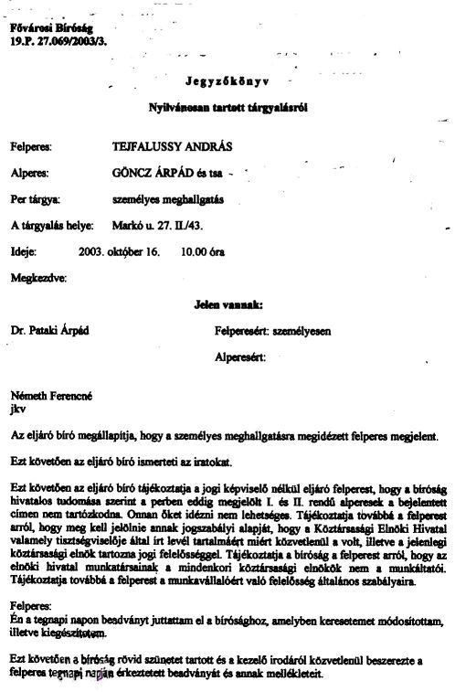 A PÉNZÜGYMINISZTER ÉS A KÖZTÁRSASÁGI ELNÖK ALPERESEK A BÍRÓSÁG NEVÉBEN A FÕVÁROSI BÍRÓSÁG NYILVÁNOS TÁRGYALÁSÁN IS FOLYTATJÁK TEJFALUSSY ANDRÁS JOGI CSELEKVÕ KÉPESSÉGE, AZAZ A VÁLASZTÓJOGA VISSZAMENÕLEGES KÉTSÉGBEVONÁSÁT A BÍRÓSÁG JEGYZÕKÖNYVÉBEN, EZ NEM CSAK (KÖZ)OKIRAT-HAMISÍTÁS, DE TUDATOS RÁGALMAZÁS ÉS BECSÜLETSÉRTÉS IS. UGYANIS AKINEK A NEVE SZEREPEPEL A VÁLASZTÁSI NÉVJEGYZÉKBEN ANNAK TELJESKÖRÛ A JOGI CSELEKVÕKÉPESSÉGE. TARTALMAZTA AZ AKTA A VÁLASZTÓI NÉVJGYZÁKBEN SZEREPLÉS ALÁBBI KÖZVETLEN BIZONYÍTÉJAIT, S AZ ALPERESEK LÁTTÁK EZEKET: