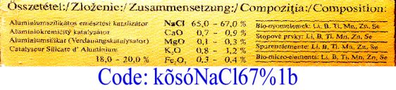 NEM VILÁGOS, HOGY BIZTOSÍTJÁK AZ ALÁBBI KÕSÓ ÖSSZETÉTELÉT, S HOGY MIÉRT KB. 20% ALUMINIUM VEGYÜLET SEGÍT PÓTOLNI "A KONYHASÓÉVAL AZONOS SÓS ÍZT.. A KÁLISÓ EGYÉBKÉNT FEDÕSÓ ÉS A TÖBBI SÓ IS KÜLÖN RÉTEGEKBEN VAN A SÓBÁNYÁKBAN!
