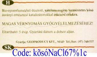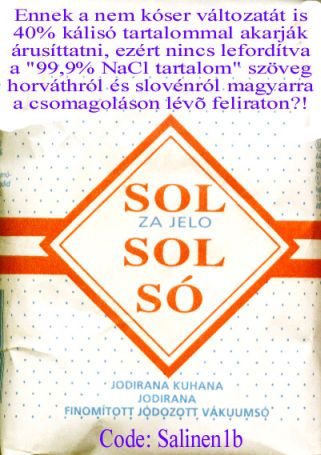 AZ ORSZÁGOS TÁPLÁLKOZÁS TUDOMÁNYI INTÉZET (OÉTI) SZERVEZETE MEG A MAGYAR TUDOMÁNYOS AKADÉMIAI ELNÖKSÉG JAVASLATÁRA, HOGY A NEM KÓSER SÓKBA KEVERJENEK KÁLISÓT, ÉS HOGY PÓTOLTASSÁK A SEJTEKEN BELÓLIOI KÁLIUMOT IS A KONYHASÓBA KEVERT KÁLISÓVAL, MINTHA AZ IS ÁLLANDÓAN ABAN A ARÁNYBAN FOGYNA, MINT A KONYHASÓ. VALÓJÁBAN KB. HARMINCSZERI KEVESEBB A SEJTEKEN KÍVÜL LÉVÕ, VAGYIS ELVESZÍTHETÕ KÁLISÓ, MINT A KONYHASÓ, ÉS ÁLLANDÓ KÁLIUMMÉRGEZÉST OKOZNAK A KÁLISÓ HARMINCSZOROSAN TÚLADAGOLÁSÁVAL. AZ INFÚZIÓS FIZIOLÓGIÁS OLDDAT IS LEGALÁBB HARMINCSZOR TÖBB KONYHASÓT PÓTOL KÁLISÓT (RINGER), VAGY EGYÁLTALÁN NEM PÓTOL KÁLISÓT (SALSOLA):
