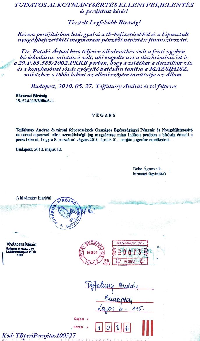 Azért fordultunk a Magyar Köztársaság Bíróságához, mert mérési adatok jutottak birtokunkba az ellenõrzési megbízásaink során arról, hogy az Országos Egészségbiztosítási Pénztár (OEP) és a Magyar Állam (MÁ), és az Adó- és Pénzügyi Ellenõrzési Hivatal (APEH) alkotmánysértõen ahhoz szedik az egészségbiztosítási járulékot (tb) és a nyugdíjbiztosítási járulékot (nyj), hogy abból egészségügyi apartheidet finanszírozzanak és ezúton elrontsák a befizetõk többsége egészségét s lecsökkentsék a befizetõk többsége élethosszát, és tönkretegyék a befizetõk többsége nemi potenciálját (szaporodási képességét), hogy ezen nyerészkedjenek a jogaikban sértett lakosok kárára. Jelen keresetpontosítás alapján a T. Bíróság ítélje el és állít/tas/sa le az alperesek károkozását: