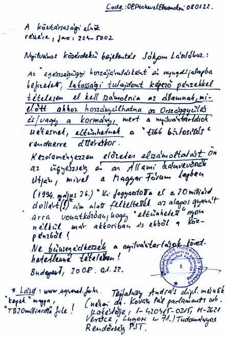 Nyílt levél! /Kód: tb-s per/ Ügyészségi szám: KF.27/1994/130-II.