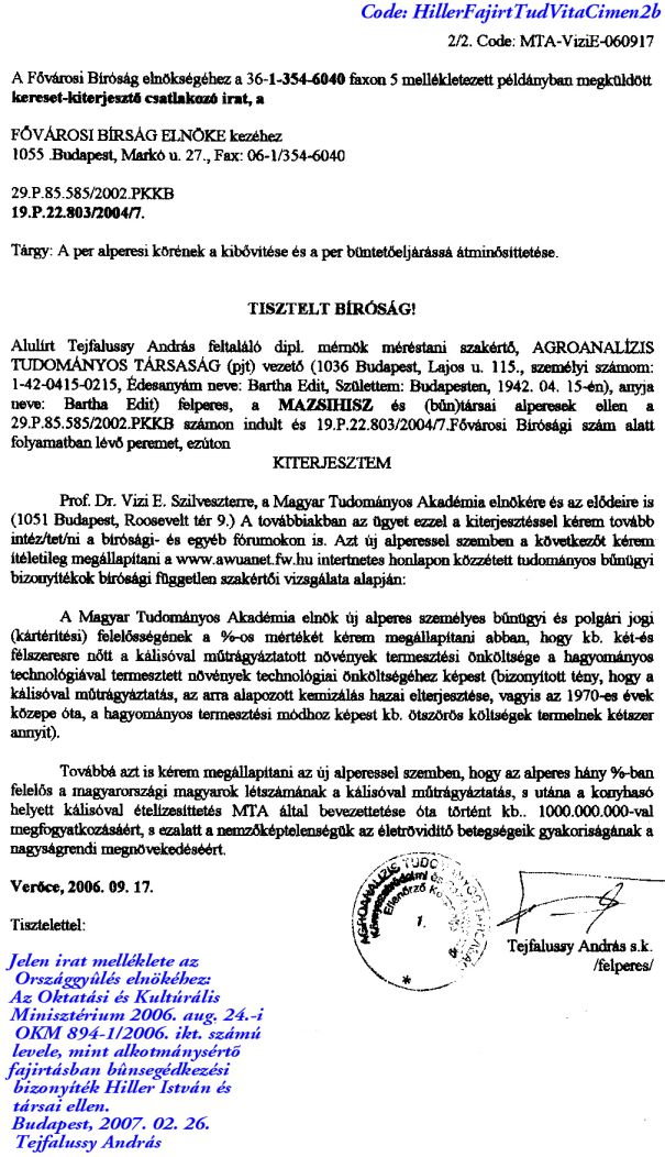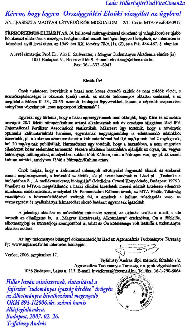 A MAGYAR TUDOMÁNYOS AKADÉMIA KUTATÓI KONYHASÓVAL KEVERT KÁLISÓVAL MÛTRÁGYÁZTATJÁK A HAZAI TERMÛTERÜLETEKET, S EZZEL TUDATOSAN TÖNKRETESZI AZ ÖSSZES MAGYAR GAZDÁT, MERT A KÁLISÓ FOKOZZA AZ ASZÁLYKÁROT ÉS EZ ÁLTAL IS, A TERMELÉSI KOCKÁZATOT, MIKÖZBEN UGYANEZ KB. 250%-OSRA NÖVELI A TERMESZTÉSI ÖNKÖLTSÉGET. MINDEZT AZ AKADÉMIAI ELNÖK LETAGADTA ÉS RÁGALMAZÁSNAK NEVEZTE, A MÛTRÁGYA HATÁSOKAT ELLENÕRZÉSRE TELJESEN ALKALMATLAN, HAMIS EREDMÉNYEKET SZOLGÁLTATÓ 50 ÉVES SAJÁT MÉRÉSEIK ALAPJÁN.