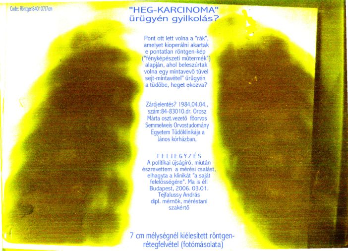 Az alábbi konkrét esetben például megkíséreltek mindenáron megmûteni tüdõrák ürügyén egy poltikai újságírót, miután egy könnyen félreértelmezhetõ megbízhatatlan röntgen-régetfelvételt készíttettek róla. Tejfalussy András azonban észrevette, hogy hamis az orvosok által hivatkozottt röntgenfelvétel, és ezután az újságíró nem engedett mintát venni a tüdejébõl, s a kimenekült mûtét elõl a kórházból . Ez 1984-ben történt. Ilymódon ma is él, sosem volt tüdõrákja. Ezután a "rákmûtétet" kierõszakolni próbáló orvoscsoport (lásd az általuk írt jelentést) kinevezte "hegkarcinomának" az általuk tervezett sejtminta-vétel helyét.