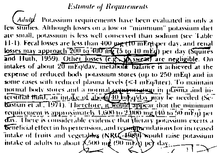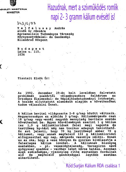 Magyarországon manapság olyan orvosok dönthetnek a mûtétek szükségességérõl a laboratóriumi mérések általuk bárhogy (félre)értelmezhetõ adatai alapján, akik például annyit sem tudnak biztosan, hogy mennyi kálium veszélytelen a vérben. Az egyik orvosi tankönyv szerint 5 maeqv/liternél, viszont egy másik szerint 7 maeqv/liternél kezdõdik a mérgezés. Az elsõ könyv szerint a 7 meqv/liternél már szívmegállás is lehetséges a kálium mérgezõ koncentrációja következtében. Az egyik orvosi könyv szerint az egy órán belül a vérbe bejutó 1,6 gramm (40 maeqv) kálium már veszedelmesen mérgezõ, mert a kálium kisebb túladagolása is ártalmas. A második orvosi könyv szerint az egy 24 órán belül a szájon át a vérbe jutó 3,6 gramm (8 gramm káliumkloridban lévõ) káliummennyiség is már biztosan szívmûködés rontó, egészséges felnõttnél is, mutatja az EKG. A hazai egészségügyi miniszterek és az országos tisztifõorvos pedig azt hirdetik, hogy az akár egy órán belül 70 grammig sem lehet mérgezõ a káliumnak a vérbe jutása. Amerikai akadémiai orvostudományi kiadvány szerint csak 0,4 gramm káliumot szükséges naponta pótolni. Az állami ajánlás ezzel szemben hazánkban 3,5 gramm. Egy vitaminokkal kereskedõ orvos "Dr. FIT" nevû cégének az egyik termékén pedig 4,5 grammnak tüntetik fel az egy napon belül akár egyszerre is enni engedett kálium hivatalos dózisát (RDA-t). (Ennyi gazánkban 3 liter Coca-Cola káliumtartalma.) Az említett amerikao akadémiai orvosi kiadvány szerint csak 0,4 gramm káliumot veszít egy egészséges felnõtt szervezete naponta (K RDA=0,4 gramm/nap), vagyis csak ennyit kell ténylegesen pótolni. Viszont a hazai tápanyagtáblázat könyvet összeállító orvosok szerint naponta legalább 3,5 gramm káliumot szükségesl pótolni (K RDA=3,5 gramm/nap),. de napi 5 gramm káliumbevitel akér egyszerre is teljesen veszélytelen, szokásos káliumdózis. Z utóbbi ünyv szerint a kálium összes mennyisége egy felnõttben 150 gramm, s ennek csak kb. 3% nincs megkötõdve a sejtekben, vagyis kb. 4,5 gramm. A fenti amerikai akadémiai orvosi könyv szerint izzadással elhanyagolható mennyiségû kálium veszíthetõ el az összesen ennyi )mobil) káliumból. Miközben a fent idézett orvosi tankönyv szerint a napi 3,5 gramm káliumbevitel szívmûködés rontó, EKG torzító hatású, a tápanyagtáblázat orvosi könyv szerint csak 17-18 gramm kálium lehet toxikus, és az ugyíancsak már idézett orvosi könyv szerint pedig az egy órán belül a vérbe (bármilyen óton) bejutó plusz 1,6 gramm kálium is biztosan veszedelmesen toxikus. E tankönyv szerint a vérben kismértékben megnövekedett kálium mennyiség is károsítja a sejteket.