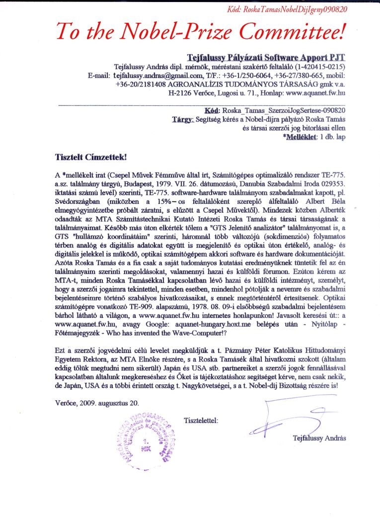 NOBEL-DÍJ BIZOTTSÁG RÉSZÉRE: To